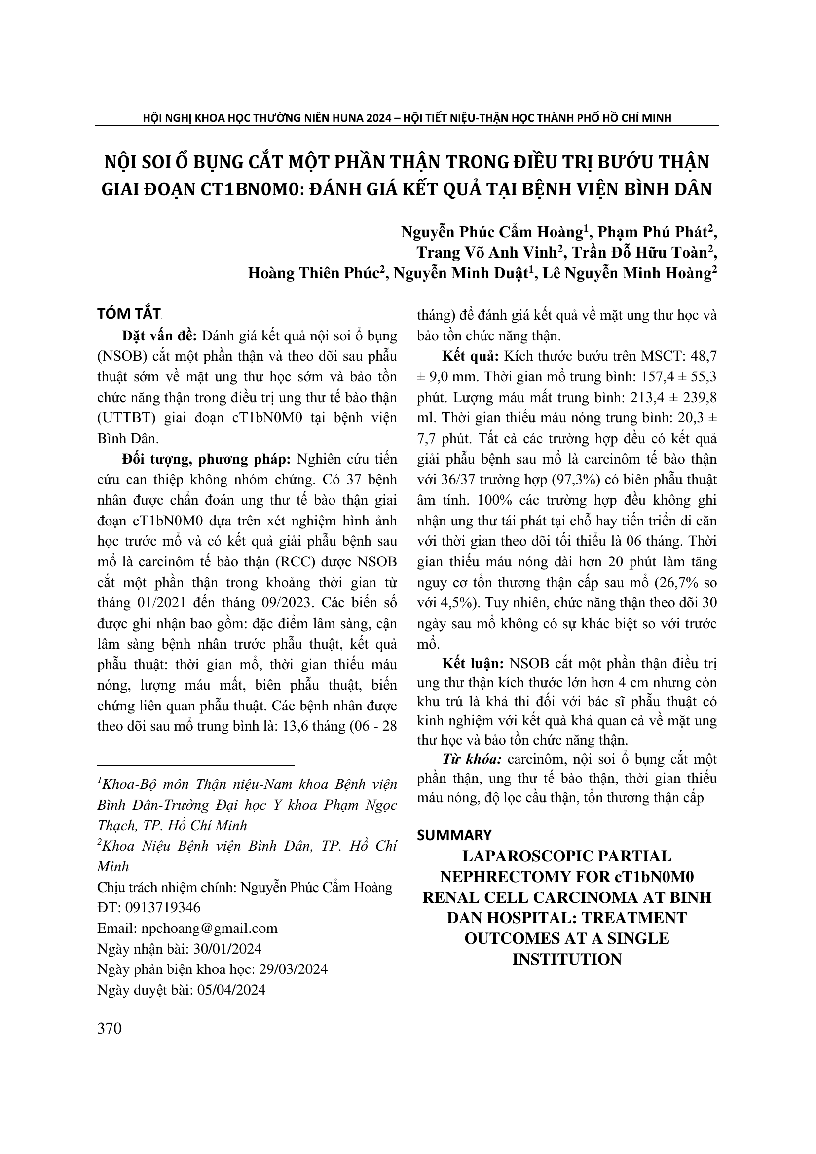 Đánh giá kết quả nội soi ổ bụng (NSOB) cắt một phần thận và theo dõi sau phẫu thuật sớm về mặt ung thư học sớm và bảo tồn chức năng thận trong điều trị ung thư tế bào thận (UTTBT) giai đoạn cT1bN0M0 tại bệnh viện Bình Dân. Đối tượng, phương pháp: Nghiên cứu tiến cứu can thiệp không nhóm chứng. Có 37 bệnh nhân được chẩn đoán ung thư tế bào thận giai đoạn cT1bN0M0 dựa trên xét nghiệm hình ảnh học trước mổ và có kết quả giải phẫu bệnh sau mổ là carcinôm tế bào thận (RCC) được NSOB cắt một phần thận trong khoảng thời gian từ tháng 01/2021 đến tháng 09/2023. Các biến số được ghi nhận bao gồm: đặc điểm lâm sàng, cận lâm sàng bệnh nhân trước phẫu thuật, kết quả phẫu thuật: thời gian mổ, thời gian thiếu máu nóng, lượng máu mất, biên phẫu thuật, biến chứng liên quan phẫu thuật. Các bệnh nhân được theo dõi sau mổ trung bình là: 13,6 tháng (06 - 28 tháng) để đánh giá kết quả về mặt ung thư học và bảo tồn chức năng thận. Kết quả: Kích thước bướu trên MSCT: 48,7 ± 9,0 mm. Thời gian mổ trung bình: 157,4 ± 55,3 phút. Lượng máu mất trung bình: 213,4 ± 239,8 ml. Thời gian thiếu máu nóng trung bình: 20,3 ± 7,7 phút. Tất cả các trường hợp đều có kết quả giải phẫu bệnh sau mổ là carcinôm tế bào thận với 36/37 trường hợp (97,3%) có biên phẫu thuật âm tính. 100% các trường hợp đều không ghi nhận ung thư tái phát tại chỗ hay tiến triển di căn với thời gian theo dõi tối thiểu là 06 tháng. Thời gian thiếu máu nóng dài hơn 20 phút làm tăng nguy cơ tổn thương thận cấp sau mổ (26,7% so với 4,5%). Tuy nhiên, chức năng thận theo dõi 30 ngày sau mổ không có sự khác biệt so với trước mổ. Kết luận: NSOB cắt một phần thận điều trị ung thư thận kích thước lớn hơn 4 cm nhưng còn khu trú là khả thi đối với bác sĩ phẫu thuật có kinh nghiệm với kết quả khả quan cả về mặt ung thư học và bảo tồn chức năng thận.