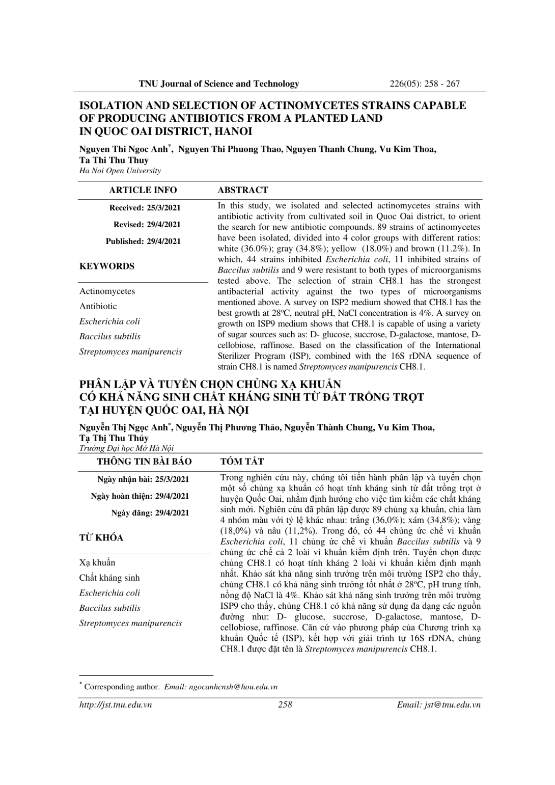 In this study, we isolated and selected actinomycetes strains with antibiotic activity from cultivated soil in Quoc Oai district, to orient the search for new antibiotic compounds. 89 strains of actinomycetes have been isolated, divided into 4 color groups with different ratios: white (36.0%); gray (34.8%); yellow (18.0%) and brown (11.2%). In which, 44 strains inhibited Escherichia coli, 11 inhibited strains of Baccilus subtilis and 9 were resistant to both types of microorganisms tested above. The selection of strain CH8.1 has the strongest antibacterial activity against the two types of microorganisms mentioned above. A survey on ISP2 medium showed that CH8.1 has the best growth at 28oC, neutral pH, NaCl concentration is 4%. A survey on growth on ISP9 medium shows that CH8.1 is capable of using a variety of sugar sources such as: D- glucose, succrose, D-galactose, mantose, D- cellobiose, raffinose. Based on the classification of the International Sterilizer Program (ISP), combined with the 16S rDNA sequence of strain CH8.1 is named Streptomyces manipurencis CH8.1.