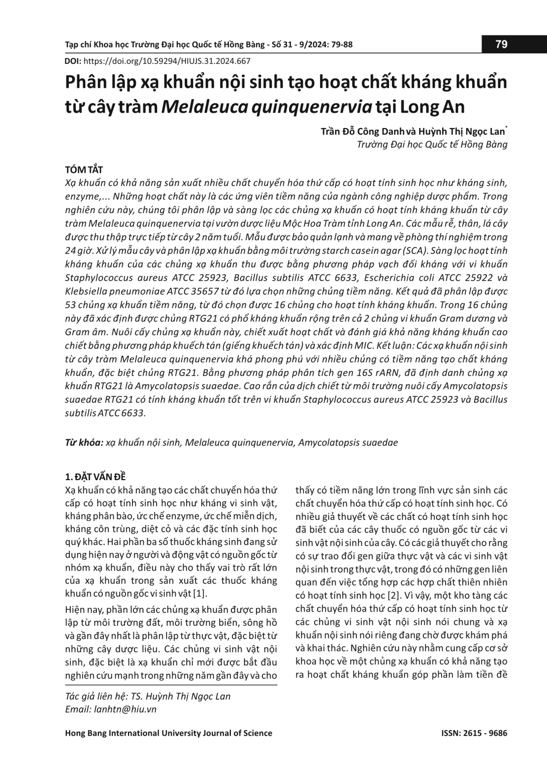 Xạ khuẩn có khả năng sản xuất nhiều chất chuyển hóa thứ cấp có hoạt tính sinh học như kháng sinh, enzyme,... Những hoạt chất này là các ứng viên tiềm năng của ngành công nghiệp dược phẩm. Trong nghiên cứu này, chúng tôi phân lập và sàng lọc các chủng xạ khuẩn có hoạt tính kháng khuẩn từ cây tràm Melaleuca quinquenervia tại vườn dược liệu Mộc Hoa Tràm tỉnh Long An. Các mẫu rễ, thân, lá cây được thu thập trực tiếp từ cây 2 năm tuổi. Mẫu được bảo quản lạnh và mang về phòng thí nghiệm trong 24 giờ. Xử lý mẫu cây và phân lập xạ khuẩn bằng môi trường starch casein agar (SCA). Sàng lọc hoạt tính kháng khuẩn của các chủng xạ khuẩn thu được bằng phương pháp vạch đối kháng với vi khuẩn Staphylococcus aureus ATCC 25923, Bacillus subtilis ATCC 6633, Escherichia coli ATCC 25922 và Klebsiella pneumoniae ATCC 35657 từ đó lựa chọn những chủng tiềm năng. Kết quả đã phân lập được 53 chủng xạ khuẩn tiềm năng, từ đó chọn được 16 chủng cho hoạt tính kháng khuẩn. Trong 16 chủng này đã xác định được chủng RTG21 có phổ kháng khuẩn rộng trên cả 2 chủng vi khuẩn Gram dương và Gram âm. Nuôi cấy chủng xạ khuẩn này, chiết xuất hoạt chất và đánh giá khả năng kháng khuẩn cao chiết bằng phương pháp khuếch tán (giếng khuếch tán) và xác định MIC. Kết luận: Các xạ khuẩn nội sinh từ cây tràm Melaleuca quinquenervia khá phong phú với nhiều chủng có tiềm năng tạo chất kháng khuẩn, đặc biệt chủng RTG21. Bằng phương pháp phân tích gen 16S rARN, đã định danh chủng xạ khuẩn RTG21 là Amycolatopsis suaedae. Cao rắn của dịch chiết từ môi trường nuôi cấy Amycolatopsis suaedae RTG21 có tính kháng khuẩn tốt trên vi khuẩn Staphylococcus aureus ATCC 25923 và Bacillus subtilis ATCC 6633.