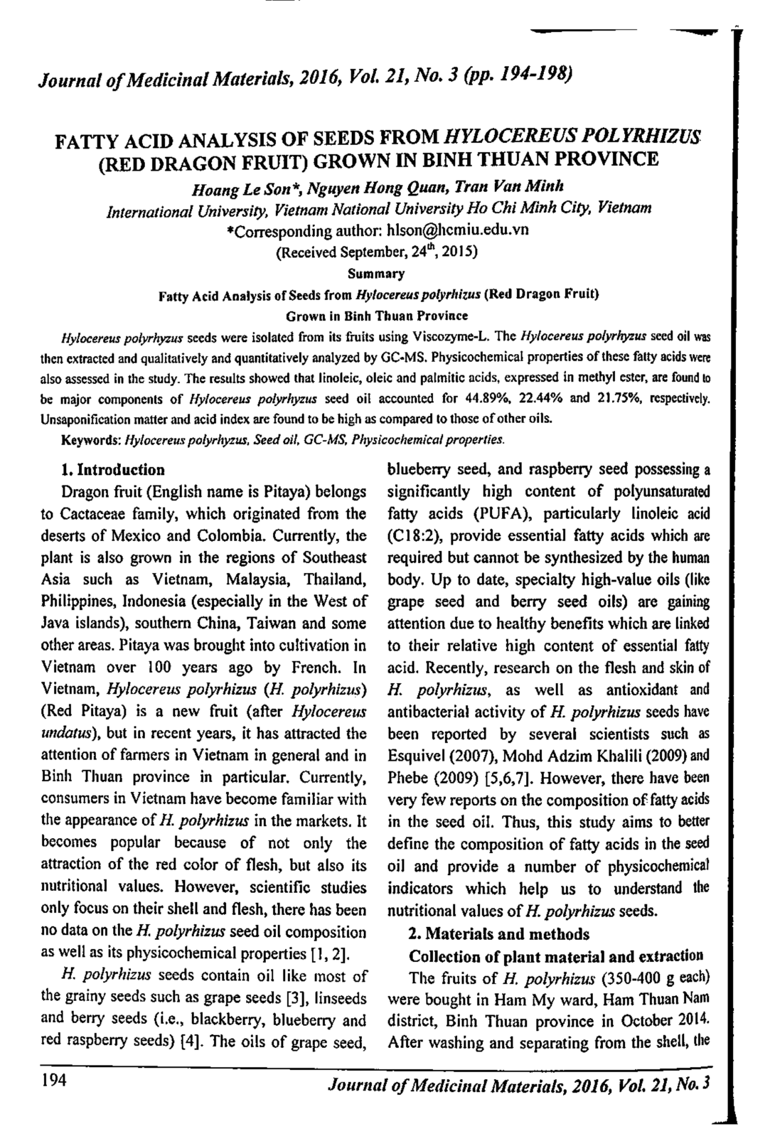 Phân tích axit béo trong hạt của quả Thanh long đỏ (Hylocereus polyrilizus) trồng tại Bình Thuận