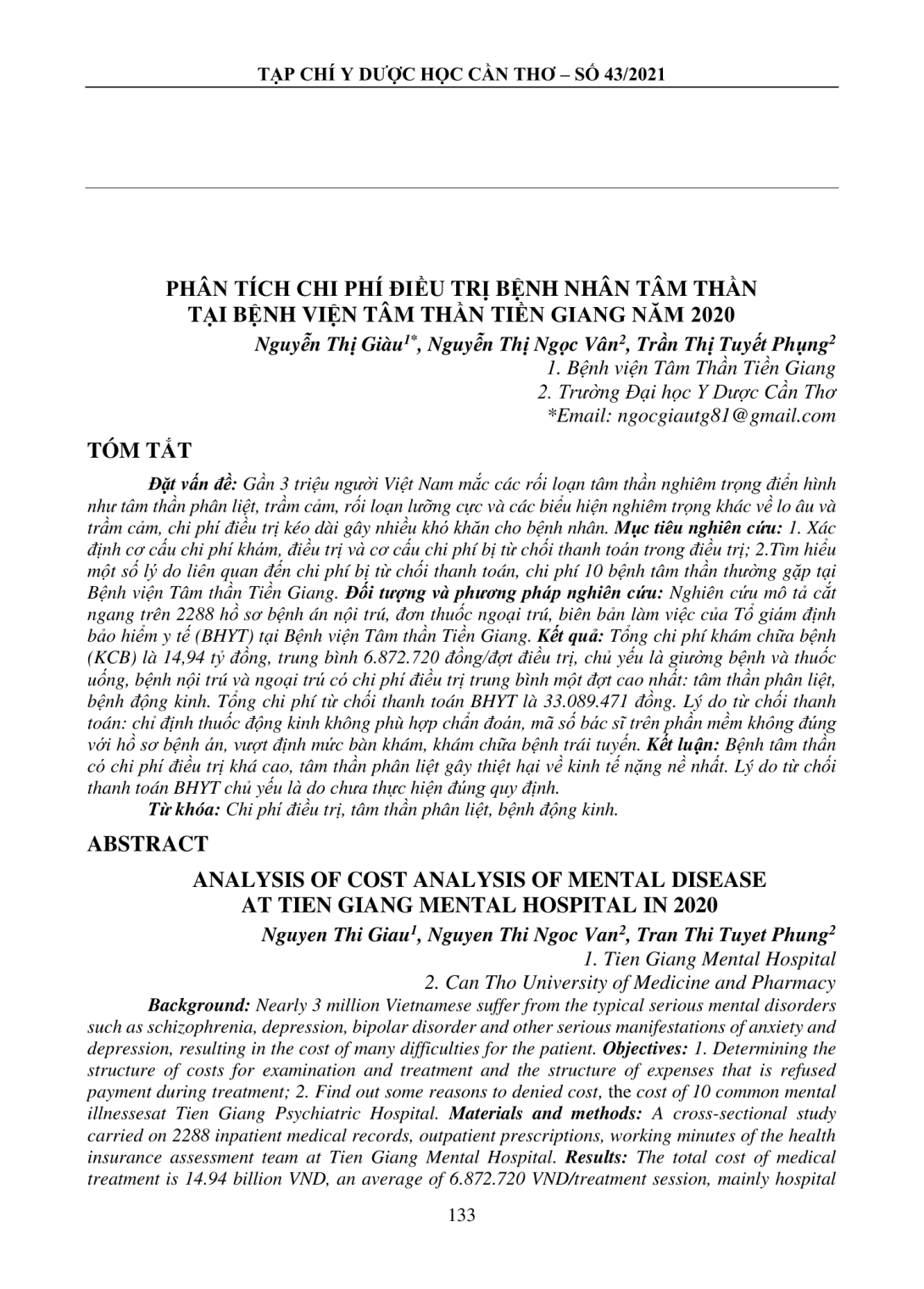 Gần 3 triệu người Việt Nam mắc các rối loạn tâm thần nghiêm trọng điển hình như tâm thần phân liệt, trầm cảm, rối loạn lưỡng cực và các biểu hiện nghiêm trọng khác về lo âu và trầm cảm, chi phí điều trị kéo dài gây nhiều khó khăn cho bệnh nhân. Mục tiêu nghiên cứu: 1. Xác định cơ cấu chi phí khám, điều trị và cơ cấu chi phí bị từ chối thanh toán trong điều trị; 2.Tìm hiểu một số lý do liên quan đến chi phí bị từ chối thanh toán, chi phí 10 bệnh tâm thần thường gặp tại Bệnh viện Tâm thần Tiền Giang. Đối tượng và phương pháp nghiên cứu: Nghiên cứu mô tả cắt ngang trên 2288 hồ sơ bệnh án nội trú, đơn thuốc ngoại trú, biên bản làm việc của Tổ giám định bảo hiểm y tế (BHYT) tại Bệnh viện Tâm thần Tiền Giang. Kết quả: Tổng chi phí khám chữa bệnh (KCB) là 14,94 tỷ đồng, trung bình 6.872.720 đồng/đợt điều trị, chủ yếu là giường bệnh và thuốc uống, bệnh nội trú và ngoại trú có chi phí điều trị trung bình một đợt cao nhất: tâm thần phân liệt, bệnh động kinh. Tổng chi phí từ chối thanh toán BHYT là 33.089.471 đồng. Lý do từ chối thanh toán: chỉ định thuốc động kinh không phù hợp chẩn đoán, mã số bác sĩ trên phần mềm không đúng với hồ sơ bệnh án, vượt định mức bàn khám, khám chữa bệnh trái tuyến. Kết luận: Bệnh tâm thần có chi phí điều trị khá cao, tâm thần phân liệt gây thiệt hại về kinh tế nặng nề nhất. Lý do từ chối thanh toán BHYT chủ yếu là do chưa thực hiện đúng quy định