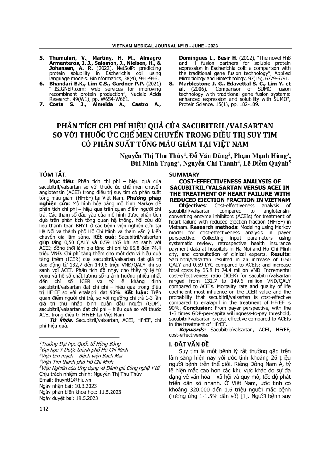 Phân tích chi phí – hiệu quả của sacubitril/valsartan so với thuốc ức chế men chuyển angiotensin (ACEI) trong điều trị suy tim có phân suất tống máu giảm (HFrEF) tại Việt Nam. Phương pháp nghiên cứu: Mô hình hóa bằng mô hình Markov để phân tích chi phí – hiệu quả trên quan điểm người chi trả. Các tham số đầu vào của mô hình được phân tích dựa trên phân tích tổng quan hệ thống, hồi cứu dữ liệu thanh toán BHYT ở các bệnh viện nghiên cứu tại Hà Nội và thành phố Hồ Chí Minh và tham vấn ý kiến chuyên gia lâm sàng. Kết quả: Sacubitril/valsartan giúp tăng 0,50 QALY và 0,59 LYG khi so sánh với ACEI; đồng thời làm gia tăng chi phí từ 65,8 đến 74,4 triệu VNĐ. Chi phí tăng thêm cho một đơn vị hiệu quả tăng thêm (ICER) của sacubitril/valsartan đạt giá trị dao động từ 132,7 đến 149,6 triệu VNĐ/QALY khi so sánh với ACEI. Phân tích độ nhạy cho thấy tỷ lệ tử vong và hệ số chất lượng sống ảnh hưởng nhiều nhất đến chỉ số ICER và tỷ lệ khẳng định sacubitril/valsartan đạt chi phí – hiệu quả trong điều trị HFrEF so với enalapril đạt 90%. Kết luận: Trên quan điểm người chi trả, so với ngưỡng chi trả 1-3 lần giá trị thu nhập bình quân đầu người (GDP), sacubitril/valsartan đạt chi phí – hiệu quả so với thuốc ACEI trong điều trị HFrEF tại Việt Nam.