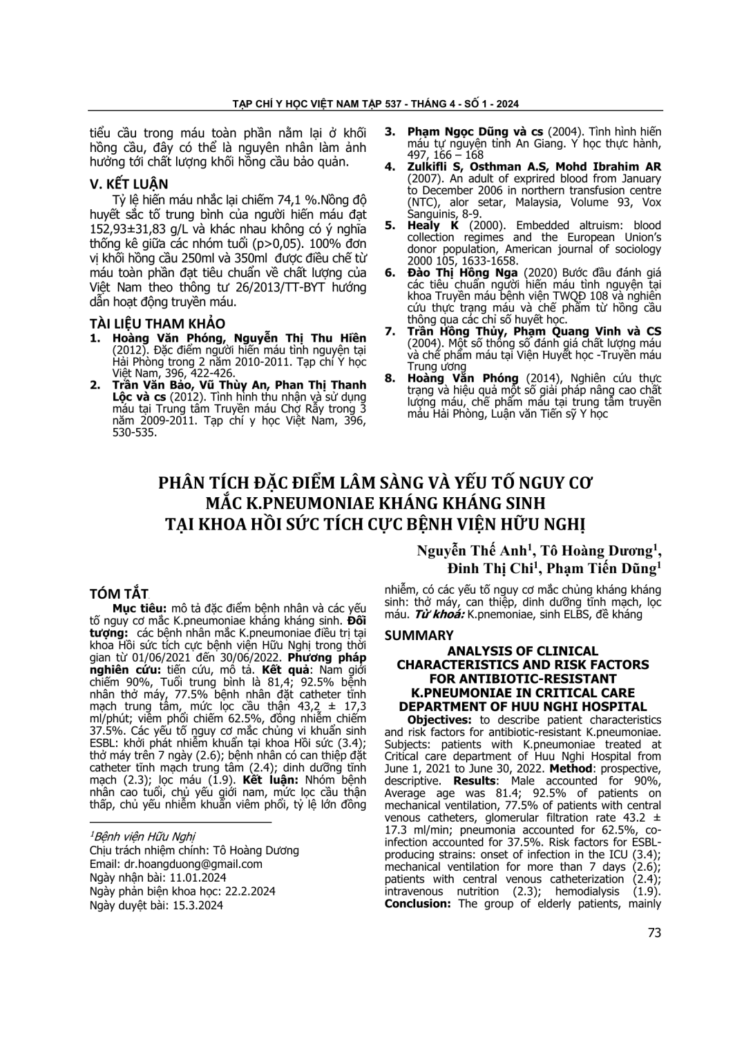 Mô tả đặc điểm bệnh nhân và các yếu tố nguy cơ mắc K.pneumoniae kháng kháng sinh. Đối tượng: các bệnh nhân mắc K.pneumoniae điều trị tại khoa Hồi sức tích cực bệnh viện Hữu Nghị trong thời gian từ 01/06/2021 đến 30/06/2022. Phương pháp nghiên cứu: tiến cứu, mô tả. Kết quả: Nam giới chiếm 90%, Tuổi trung bình là 81,4; 92.5% bệnh nhân thở máy, 77.5% bệnh nhân đặt catheter tĩnh mạch trung tâm, mức lọc cầu thận 43,2 ± 17,3 ml/phút; viêm phổi chiếm 62.5%, đồng nhiễm chiếm 37.5%. Các yếu tố nguy cơ mắc chủng vi khuẩn sinh ESBL: khởi phát nhiễm khuẩn tại khoa Hồi sức (3.4); thở máy trên 7 ngày (2.6); bệnh nhân có can thiệp đặt catheter tĩnh mạch trung tâm (2.4); dinh dưỡng tĩnh mạch (2.3); lọc máu (1.9). Kết luận: Nhóm bệnh nhân cao tuổi, chủ yếu giới nam, mức lọc cầu thận thấp, chủ yếu nhiễm khuẩn viêm phổi, tỷ lệ lớn đồng nhiễm, có các yếu tố nguy cơ mắc chủng kháng kháng sinh: thở máy, can thiệp, dinh dưỡng tĩnh mạch, lọc máu.