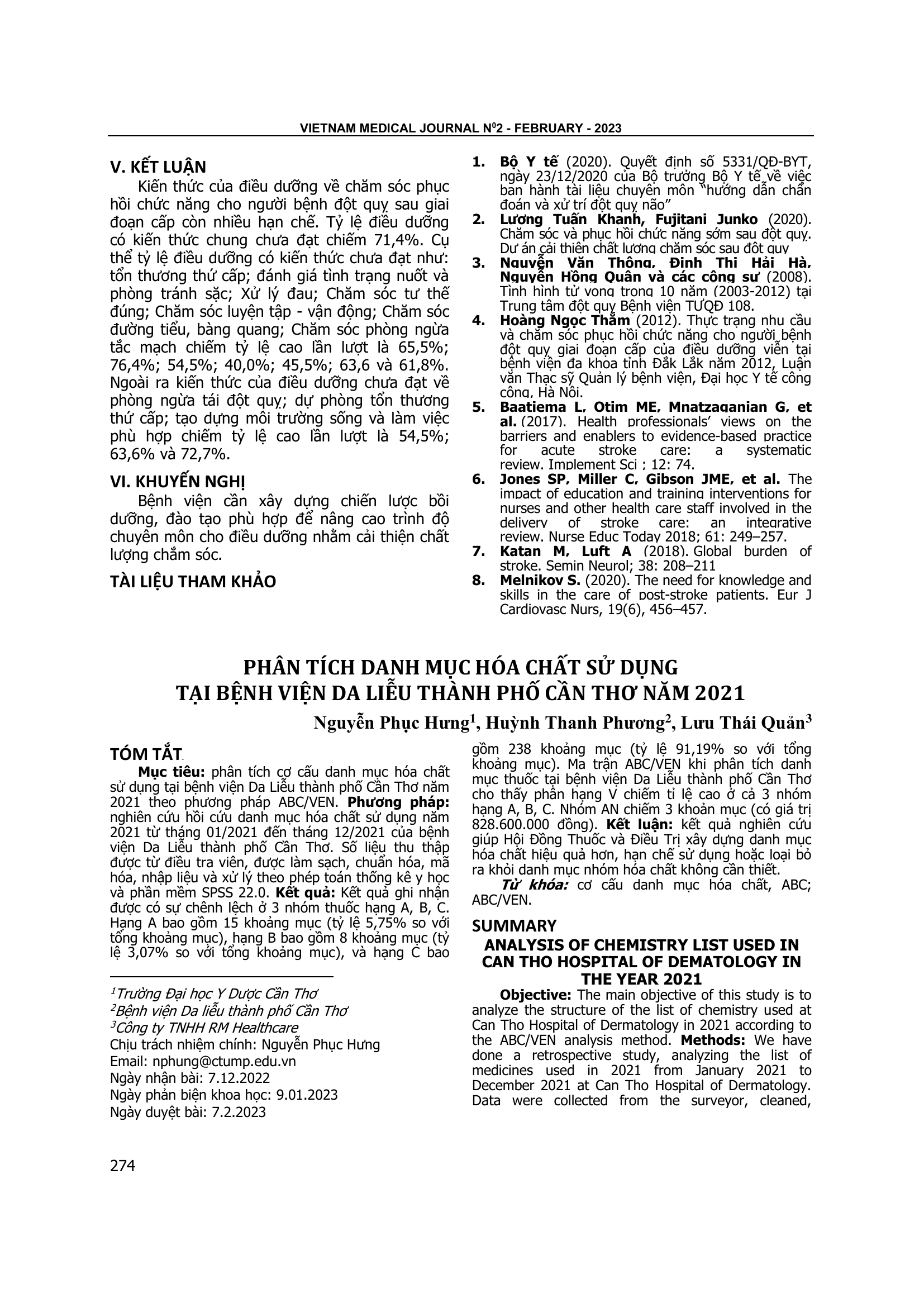 Phân tích cơ cấu danh mục hóa chất sử dụng tại bệnh viện Da Liễu thành phố Cần Thơ năm 2021 theo phương pháp ABC/VEN. Phương pháp: nghiên cứu hồi cứu danh mục hóa chất sử dụng năm 2021 từ tháng 01/2021 đến tháng 12/2021 của bệnh viện Da Liễu thành phố Cần Thơ. Số liệu thu thập được từ điều tra viên, được làm sạch, chuẩn hóa, mã hóa, nhập liệu và xử lý theo phép toán thống kê y học và phần mềm SPSS 22.0. Kết quả: Kết quả ghi nhận được có sự chênh lệch ở 3 nhóm thuốc hạng A, B, C. Hạng A bao gồm 15 khoảng mục (tỷ lệ 5,75% so với tổng khoảng mục), hạng B bao gồm 8 khoảng mục (tỷ lệ 3,07% so với tổng khoảng mục), và hạng C bao gồm 238 khoảng mục (tỷ lệ 91,19% so với tổng khoảng mục). Ma trận ABC/VEN khi phân tích danh mục thuốc tại bệnh viện Da Liễu thành phố Cần Thơ cho thấy phân hạng V chiếm tỉ lệ cao ở cả 3 nhóm hạng A, B, C. Nhóm AN chiếm 3 khoản mục (có giá trị 828.600.000 đồng). Kết luận: kết quả nghiên cứu giúp Hội Đồng Thuốc và Điều Trị xây dựng danh mục hóa chất hiệu quả hơn, hạn chế sử dụng hoặc loại bỏ ra khỏi danh mục nhóm hóa chất không cần thiết.