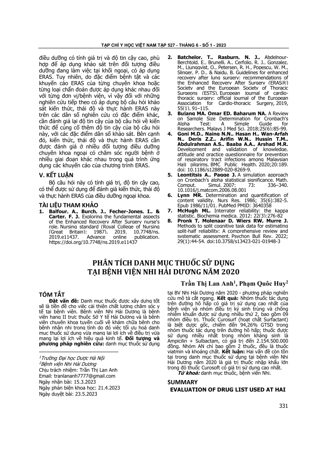 well-developed drug list will be a prerequisite for work to improve the quality of medical care in hospitals. Hai Duong Children's Hospital is a Grade II hospital is a specialized hospital at the last level of medical examination and treatment for pediatric patients in the province, so the drug list is optimized brings both benefits of treatment and economic. Materials and methods: drug list used at Hai Duong children’s hosphital in 2020, using cross-sectional descriptive methods. Results: The group of drugs acting on the respiratory tracts were the highest cost and the second was anti-parasitic and anti-infective treatment group, including 09 subgroups. Curosurf (active ingredient Surfactant) is the original brand name, accounted for 94.26% of the cost in the group of drugs acting on the respiratory tract; the most used drug in the antibiotic group was ampicillin + sulbactam. Group AN includes two drugs, both vitamins and minerals. Conclusion: The problem in the drug list used at Hai Duong Children's Hospital in 2020 are the high cost of imported drugs, in which Curosoft was the highest.