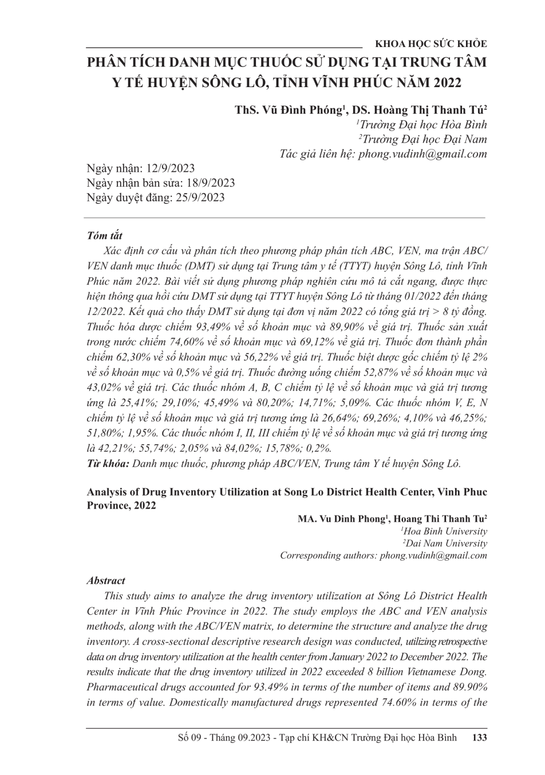 This study aims to analyze the drug inventory utilization at Sông Lô District Health Center in Vĩnh Phúc Province in 2022. The study employs the ABC and VEN analysis methods, along with the ABC/VEN matrix, to determine the structure and analyze the drug inventory. A cross-sectional descriptive research design was conducted, utilizing retrospective data on drug inventory utilization at the health center from January 2022 to December 2022. The results indicate that the drug inventory utilized in 2022 exceeded 8 billion Vietnamese Dong. Pharmaceutical drugs accounted for 93.49% in terms of the number of items and 89.90% in terms of value. Domestically manufactured drugs represented 74.60% in terms of the number of items and 69.12% in terms of value. Single-component drugs accounted for 62.30% in terms of the number of items and 56.22% in terms of value. Generic drugs accounted for 2% in terms of the number of items and 0.5% in terms of value. Oral medications constituted 52.87% in terms of the number of items and 43.02% in terms of value. The respective proportions of drug items and value for Groups A, B, and C were 25.41%, 29.10%, and 45.49% and 80.20%, 14.71%, and 5.09%. For Groups V, E, and N, the corresponding proportions of drug items and value were 26.64%, 69.26%, and 4.10% and 46.25%, 51.80%, and 1.95%. In terms of drug items and value, Groups I, II, and III accounted for 42.21%, 55.74%, and 2.05% and 84.02%, 15.78%, and 0.2%, respectively.