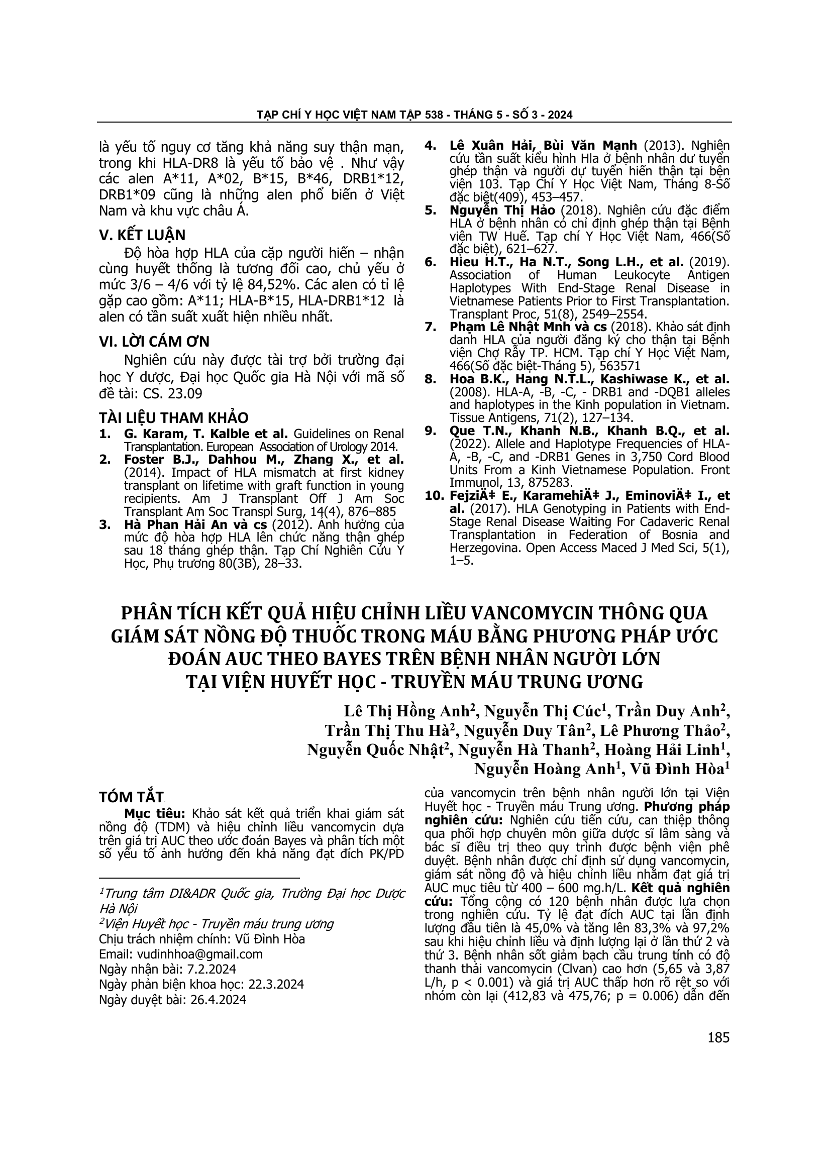 Khảo sát kết quả triển khai giám sát nồng độ (TDM) và hiệu chỉnh liều vancomycin dựa trên giá trị AUC theo ước đoán Bayes và phân tích một số yếu tố ảnh hưởng đến khả năng đạt đích PK/PD của vancomycin trên bệnh nhân người lớn tại Viện Huyết học - Truyền máu Trung ương. Phương pháp nghiên cứu: Nghiên cứu tiến cứu, can thiệp thông qua phối hợp chuyên môn giữa dược sĩ lâm sàng và bác sĩ điều trị theo quy trình được bệnh viện phê duyệt. Bệnh nhân được chỉ định sử dụng vancomycin, giám sát nồng độ và hiệu chỉnh liều nhằm đạt giá trị AUC mục tiêu từ 400 – 600 mg.h/L. Kết quả nghiên cứu: Tổng cộng có 120 bệnh nhân được lựa chọn trong nghiên cứu. Tỷ lệ đạt đích AUC tại lần định lượng đầu tiên là 45,0% và tăng lên 83,3% và 97,2% sau khi hiệu chỉnh liều và định lượng lại ở lần thứ 2 và thứ 3. Bệnh nhân sốt giảm bạch cầu trung tính có độ thanh thải vancomycin (Clvan) cao hơn (5,65 và 3,87 L/h, p < 0.001) và giá trị AUC thấp hơn rõ rệt so với nhóm còn lại (412,83 và 475,76; p = 0.006) dẫn đến nguy cơ thiếu liều kháng sinh. Tuổi > 60 và độ thanh thải creatinin > 90 mL/phút đều được ghi nhận ảnh hưởng rõ rệt đến Clvan và khả năng đạt đích AUC. Kết luận: Kết quả nghiên cứu cho thấy sự cần thiết của việc giám sát nồng độ và hiệu chỉnh liều vancomycin theo phương pháp Bayes, đặc biệt với các bệnh nhân cao tuổi, có chức năng thận cao và có sốt giảm bạch cầu trung tính để giúp tối ưu liều, đảm bảo hiệu quả điều trị và giảm thiểu độc tính của vancomycin trong thực hành lâm sàng Huyết học.