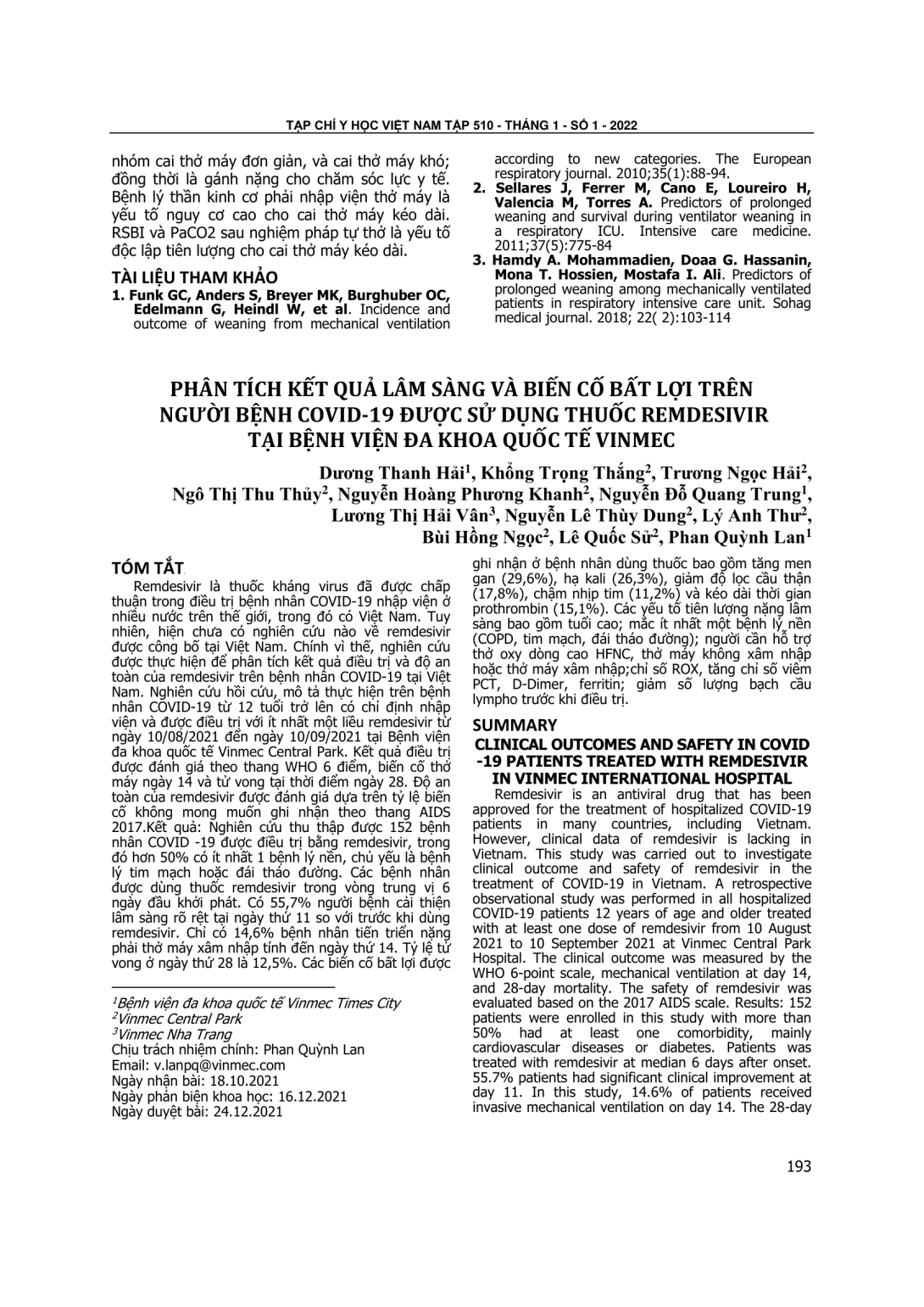 Remdesivir là thuốc kháng virus đã được chấp thuận trong điều trị bệnh nhân COVID-19 nhập viện ở nhiều nước trên thế giới, trong đó có Việt Nam. Tuy nhiên, hiện chưa có nghiên cứu nào về remdesivir được công bố tại Việt Nam. Chính vì thế, nghiên cứu được thực hiện để phân tích kết quả điều trị và độ an toàn của remdesivir trên bệnh nhân COVID-19 tại Việt Nam. Nghiên cứu hồi cứu, mô tả thực hiện trên bệnh nhân COVID-19 từ 12 tuổi trở lên có chỉ định nhập viện và được điều trị với ít nhất một liều remdesivir từ ngày 10/08/2021 đến ngày 10/09/2021 tại Bệnh viện đa khoa quốc tế Vinmec Central Park. Kết quả điều trị được đánh giá theo thang WHO 6 điểm, biến cố thở máy ngày 14 và tử vong tại thời điểm ngày 28. Độ an toàn của remdesivir được đánh giá dựa trên tỷ lệ biến cố không mong muốn ghi nhận theo thang AIDS 2017.Kết quả: Nghiên cứu thu thập được 152 bệnh nhân COVID -19 được điều trị bằng remdesivir, trong đó hơn 50% có ít nhất 1 bệnh lý nền, chủ yếu là bệnh lý tim mạch hoặc đái tháo đường. Các bệnh nhân được dùng thuốc remdesivir trong vòng trung vị 6 ngày đầu khởi phát. Có 55,7% người bệnh cải thiện lâm sàng rõ rệt tại ngày thứ 11 so với trước khi dùng remdesivir. Chỉ có 14,6% bệnh nhân tiến triển nặng phải thở máy xâm nhập tính đến ngày thứ 14. Tỷ lệ tử vong ở ngày thứ 28 là 12,5%. Các biến cố bất lợi được ghi nhận ở bệnh nhân dùng thuốc bao gồm tăng men gan (29,6%), hạ kali (26,3%), giảm độ lọc cầu thận (17,8%), chậm nhịp tim (11,2%) và kéo dài thời gian prothrombin (15,1%). Các yếu tố tiên lượng nặng lâm sàng bao gồm tuổi cao; mắc ít nhất một bệnh lý nền (COPD, tim mạch, đái tháo đường); người cần hỗ trợ thở oxy dòng cao HFNC, thở máy không xâm nhập hoặc thở máy xâm nhập;chỉ số ROX, tăng chỉ số viêm PCT, D-Dimer, ferritin; giảm số lượng bạch cầu lympho trước khi điều trị.