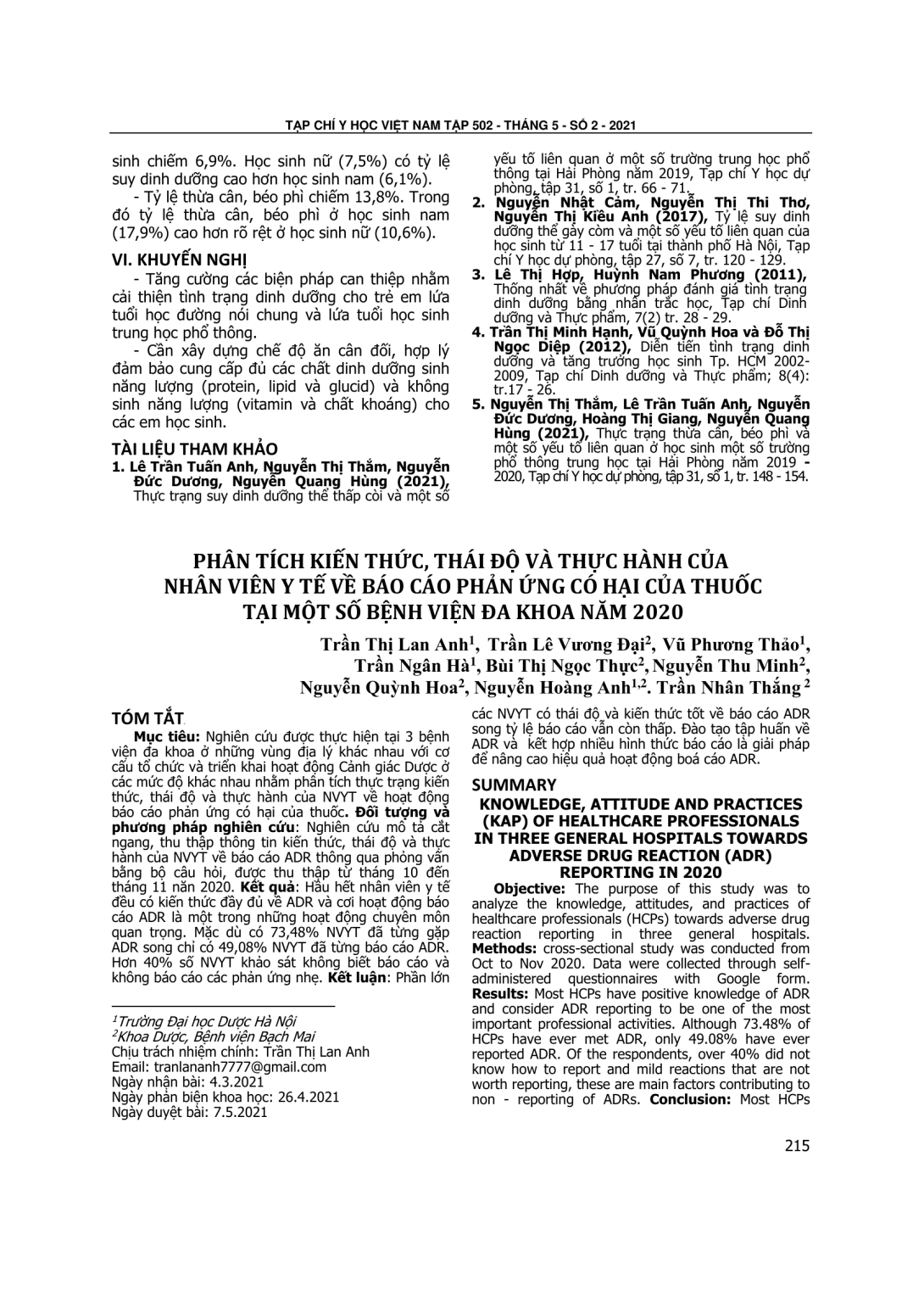 Nghiên cứu được thực hiện tại 3 bệnh viện đa khoa ở những vùng địa lý khác nhau với cơ cấu tổ chức và triển khai hoạt động Cảnh giác Dược ở các mức độ khác nhau nhằm phân tích thực trạng kiến thức, thái độ và thực hành của NVYT về hoạt động báo cáo phản ứng có hại của thuốc. Đối tượng và phương pháp nghiên cứu: Nghiên cứu mô tả cắt ngang, thu thập thông tin kiến thức, thái độ và thực hành của NVYT về báo cáo ADR thông qua phỏng vấn bằng bộ câu hỏi, được thu thập từ tháng 10 đến tháng 11 năn 2020. Kết quả: Hầu hết nhân viên y tế đều có kiến thức đầy đủ về ADR và cơi hoạt động báo cáo ADR là một trong những hoạt động chuyên môn quan trọng. Mặc dù có 73,48% NVYT đã từng gặp ADR song chỉ có 49,08% NVYT đã từng báo cáo ADR. Hơn 40% số NVYT khảo sát không biết báo cáo và không báo cáo các phản ứng nhẹ. Kết luận: Phần lớn các NVYT có thái độ và kiến thức tốt về báo cáo ADR song tỷ lệ báo cáo vẫn còn thấp. Đào tạo tập huấn về ADR và kết hợp nhiều hình thức báo cáo là giải pháp để nâng cao hiệu quả hoạt động boá cáo ADR.