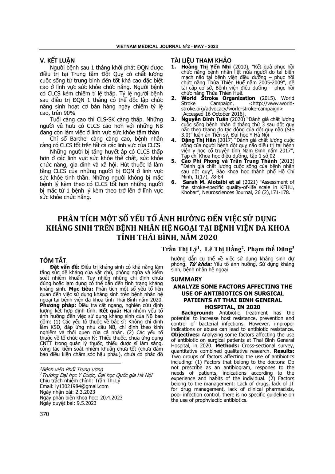 Điều trị kháng sinh có khả năng làm tăng sức đề kháng của vật chủ, phòng ngừa và kiểm soát nhiễm khuẩn. Tuy nhiên những chỉ định chưa đúng hoặc lạm dụng có thể dẫn đến tình trạng kháng kháng sinh. Mục tiêu: Phân tích một số yếu tố liên quan đến việc sử dụng kháng sinh trên bệnh nhân hệ ngoại tại bệnh viện đa khoa tỉnh Thái Bình năm 2020. Phương pháp: Điều tra cắt ngang, nghiên cứu định lượng kết hợp định tính. Kết quả: Hai nhóm yếu tố ảnh hưởng đến việc sử dụng kháng sinh của NB bao gồm: (1) Các yếu tố thuộc về bác sĩ: Không chỉ định làm KSĐ, đáp ứng nhu cầu NB, chỉ định theo kinh nghiệm và thói quen của cá nhân. (2) Các yếu tố thuộc về tổ chức quản lý: Thiếu thuốc, chưa ứng dụng CNTT trong quản lý thuốc, thiếu dược sĩ lâm sàng, công tác kiểm soát nhiễm khuẩn chưa tốt (chưa đảm bảo điều kiện chăm sóc hậu phẫu), chưa có phác đồ hướng dẫn cụ thể về việc sử dụng kháng sinh dự phòng.