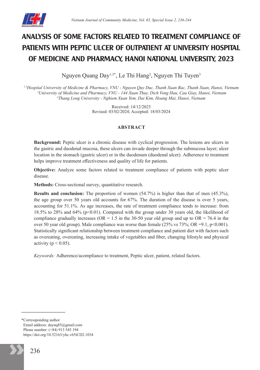 Peptic ulcer is a chronic disease with cyclical progression. The lesions are ulcers in the gastric and duodenal mucosa, these ulcers can invade deeper through the submucosa layer; ulcer location in the stomach (gastric ulcer) or in the duodenum (duodenal ulcer). Adherence to treatment helps improve treatment effectiveness and quality of life for patients.Objective: Analyze some factors related to treatment compliance of patients with peptic ulcer disease.Methods: Cross-sectional survey, quantitative research. Results and conclusion: The proportion of women (54.7%) is higher than that of men (45.3%), the age group over 50 years old accounts for 67%. The duration of the disease is over 5 years, accounting for 51.1%. As age increases, the rate of treatment compliance tends to increase: from 18.5% to 28% and 64% (p<0.01). Compared with the group under 30 years old, the likelihood of compliance gradually increases (OR = 1.5 in the 30-50 year old group and up to OR = 76.4 in the over 50 year old group). Male compliance was worse than female (25% vs 73%; OR =9.1, p<0.001). Statistically significant relationship between treatment compliance and patient diet with factors such as overeating, overeating, increasing intake of vegetables and fiber, changing lifestyle and physical activity (p < 0.05).