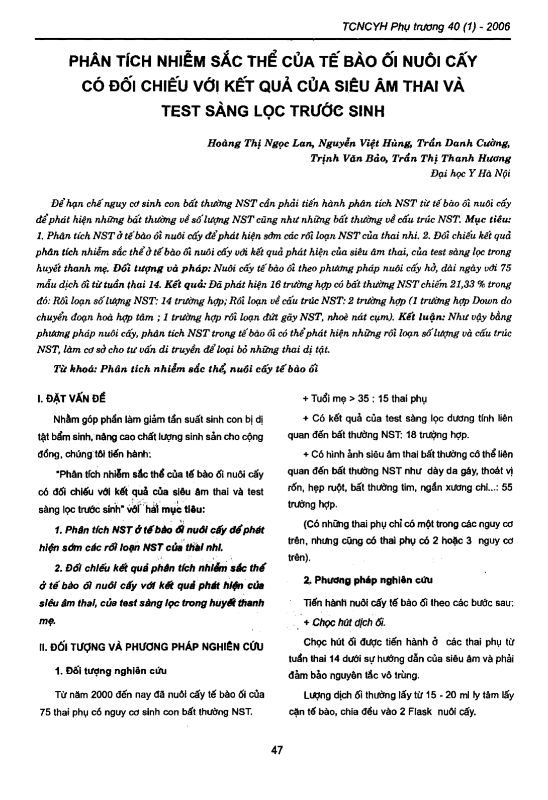 Phân tích nhiễn sắc thể (NST) của tế bào ối nuôi cấy có đối chiếu với kết quả của siêu âm thai và sàng lọc trước sinh
