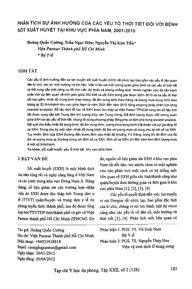 Determinants of dengue transmission dynamics are complex and are likely to include environmental and climate factors. Understanding of the spatio-temporal trends of dengue incidence may help to improve tools for predicting models the timing and magnitude of annual dengue epidemics. To determine if dengue cases increase is correlated with climate factors in 20 provinces in Southern Vietnam, the authors undertook a temporal analysis between 592,938 dengue cases notified in Southern Vietnam and three climate factors: monthly average temperature, monthly average humidity, monthly rainfall from 2001 to 2010 by using wavelet analysis. Dengue data was collected at Pasteur Institute in Ho Chi Minh city while climate data was supplied by the National Center of Hydrometeological station. To quantify the association (phase analysis) between monthly dengue cases and climate factors (mean temperature, rainfall, and humidity), phase analyses were performed with wavelet analysis. The result showed that temperature, humidity, and rainfall correlated positively with dengue incidence. In the annual cycle, mean temperature is in phase with dengue incidence with a lag of approximately one or two month. Humidity and rainfall is often in phase with dengue incidence with synchronized peak, a lag of less than one month was observed in small numer of provinces. Climate factors were found to be an key role in driving the accelaration of dengue incidence in Central of Vietnam.