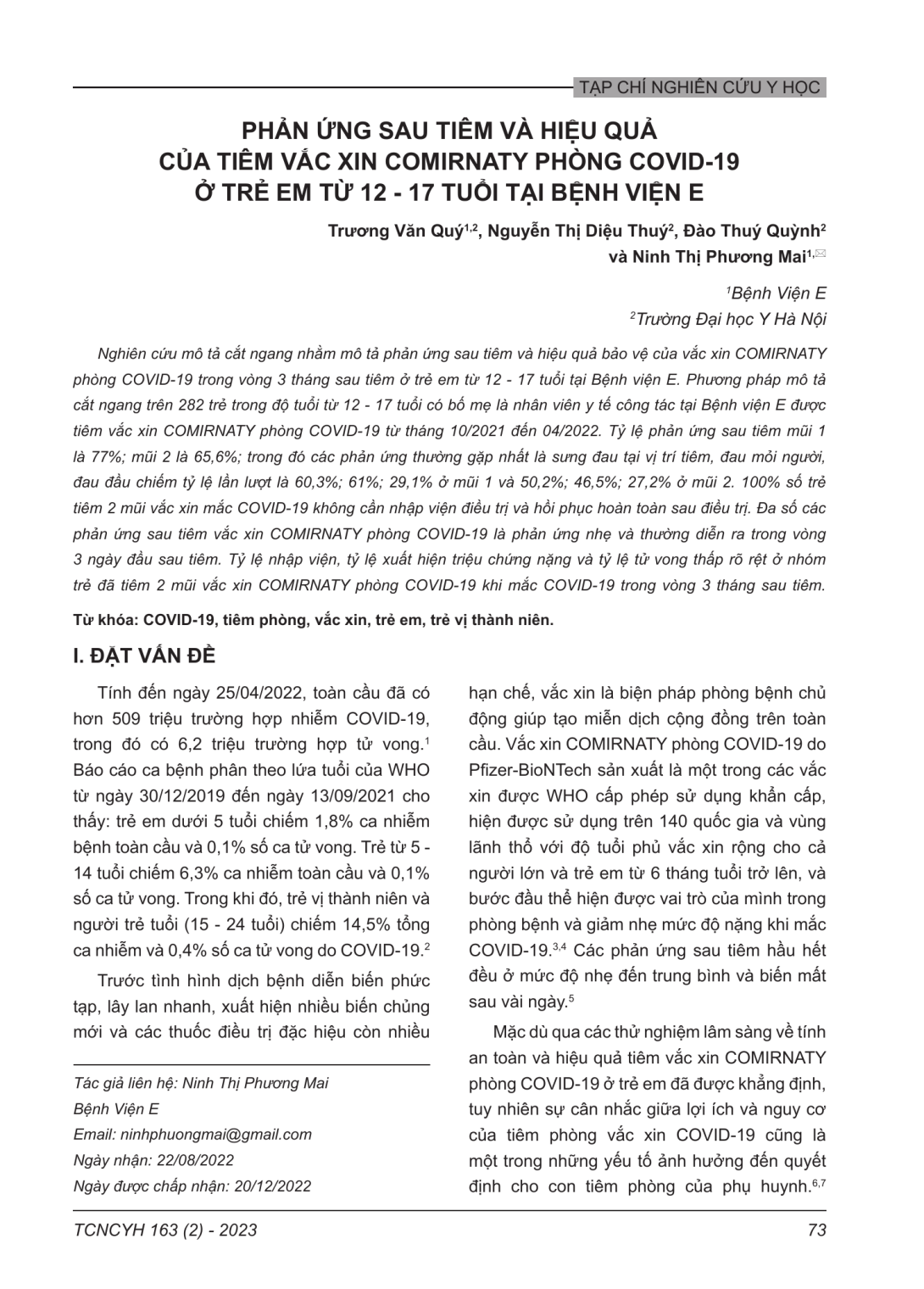 Nghiên cứu mô tả cắt ngang nhằm mô tả phản ứng sau tiêm và hiệu quả bảo vệ của vắc xin COMIRNATY phòng COVID-19 trong vòng 3 tháng sau tiêm ở trẻ em từ 12 - 17 tuổi tại Bệnh viện E. Phương pháp mô tả cắt ngang trên 282 trẻ trong độ tuổi từ 12 - 17 tuổi có bố mẹ là nhân viên y tế công tác tại Bệnh viện E được tiêm vắc xin COMIRNATY phòng COVID-19 từ tháng 10/2021 đến 04/2022. Tỷ lệ phản ứng sau tiêm mũi 1 là 77%; mũi 2 là 65,6%; trong đó các phản ứng thường gặp nhất là sưng đau tại vị trí tiêm, đau mỏi người, đau đầu chiếm tỷ lệ lần lượt là 60,3%; 61%; 29,1% ở mũi 1 và 50,2%; 46,5%; 27,2% ở mũi 2. 100% số trẻ tiêm 2 mũi vắc xin mắc COVID-19 không cần nhập viện điều trị và hồi phục hoàn toàn sau điều trị. Đa số các phản ứng sau tiêm vắc xin COMIRNATY phòng COVID-19 là phản ứng nhẹ và thường diễn ra trong vòng 3 ngày đầu sau tiêm. Tỷ lệ nhập viện, tỷ lệ xuất hiện triệu chứng nặng và tỷ lệ tử vong thấp rõ rệt ở nhóm trẻ đã tiêm 2 mũi vắc xin COMIRNATY phòng COVID-19 khi mắc COVID-19 trong vòng 3 tháng sau tiêm.