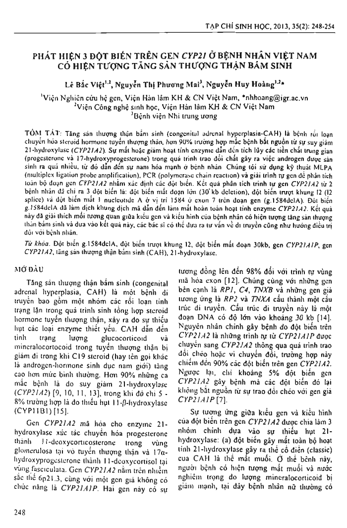 Congenital adrenal hyperplasia (CAH) is a disease causing disorders in adrenal steroid hormone metabolism, above 90 percent cases are derived from 21-hydroxylase deficiency. The loss or reducing of this enzyme activity leads to accumulating of intermediate precusor (progesterone and 17-hydroxyprogesterone) in adrenal gland metabolism, resulting in overproduction of androgen which causes virilization signs in patients. In this study, the authors utilized MLPA (multiplex ligation probe amplification) technique, PCR (polymerase chain reaction) and entire CYP21A2 gene sequencing method to detect mutations. The CYP21A2 gene analysis results from two female patients identified three mutations, including 30 kb deletion mutation, 12 splice mutation and g.1584de1A in exon 7 of the CYP21A2 gene. The mutation g.1584de1A is responsible for transcated protein of 21-hydroxylase, therefore this enzyme is impaired completely. These results proved the correlations between genotype and phenotype of patients having signs of CAH and based on them, doctors can bring out useful genetic consultants as well as therapy treatments for patients.