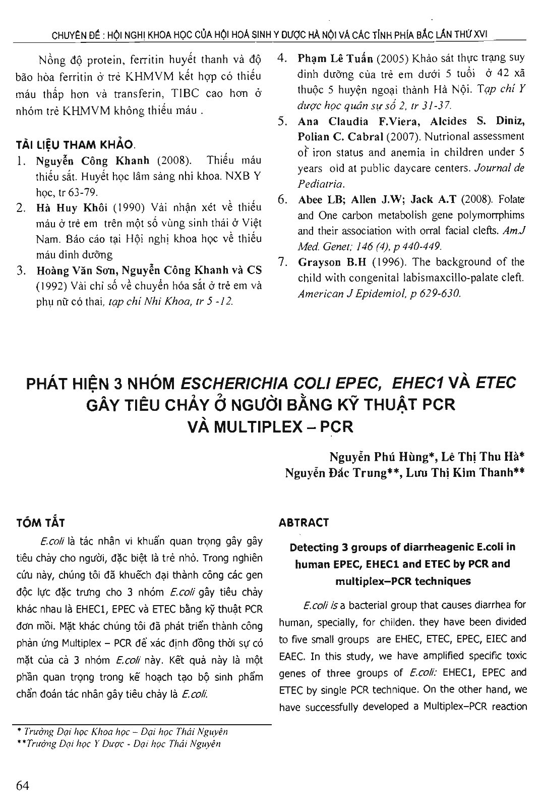 Phát hiện 3 nhóm Escherichia Coli Epec, EHEC1 và ETEC gây tiêu chảy ở người bằng kỹ thuật PCR và Multiplex - PCR
