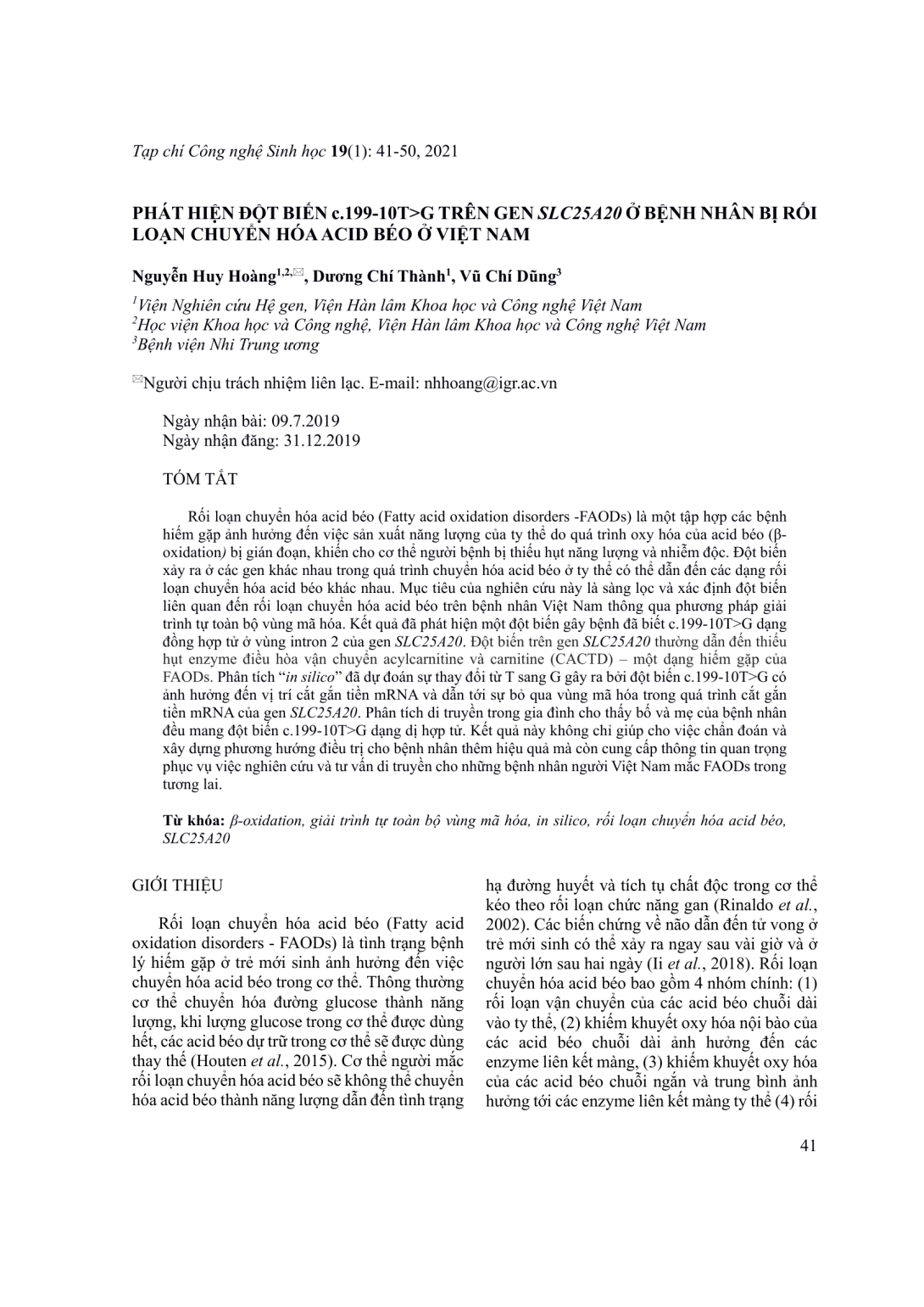 Rối loạn chuyển hóa acid béo (Fatty acid oxidation disorders -FAODs) là một tập hợp các bệnh hiếm gặp ảnh hưởng đến việc sản xuất năng lượng của ty thể do quá trình oxy hóa của acid béo (β-oxidation) bị gián đoạn, khiến cho cơ thể người bệnh bị thiếu hụt năng lượng và nhiễm độc. Đột biến xảy ra ở các gen khác nhau trong quá trình chuyển hóa acid béo ở ty thể có thể dẫn đến các dạng rối loạn chuyển hóa acid béo khác nhau. Mục tiêu của nghiên cứu này là sàng lọc và xác định đột biến liên quan đến rối loạn chuyển hóa acid béo trên bệnh nhân Việt Nam thông qua phương pháp giải trình tự toàn bộ vùng mã hóa. Kết quả đã phát hiện một đột biến gây bệnh đã biết c.199-10T>G dạng đồng hợp tử ở vùng intron 2 của gen SLC25A20. Đột biến trên gen SLC25A20 thường dẫn đến thiếu hụt enzyme điều hòa vận chuyển acylcarnitine và carnitine (CACTD) – một dạng hiếm gặp của FAODs. Phân tích “in silico” đã dự đoán sự thay đổi từ T sang G gây ra bởi đột biến c.199-10T>G có ảnh hưởng đến vị trí cắt gắn tiền mRNA và dẫn tới sự bỏ qua vùng mã hóa trong quá trình cắt gắn tiền mRNA của gen SLC25A20. Phân tích di truyền trong gia đình cho thấy bố và mẹ của bệnh nhân đều mang đột biến c.199-10T>G dạng dị hợp tử. Kết quả này không chỉ giúp cho việc chẩn đoán và xây dựng phương hướng điều trị cho bệnh nhân thêm hiệu quả mà còn cung cấp thông tin quan trọng phục vụ việc nghiên cứu và tư vấn di truyền cho những bệnh nhân người Việt Nam mắc FAODs trong tương lai.