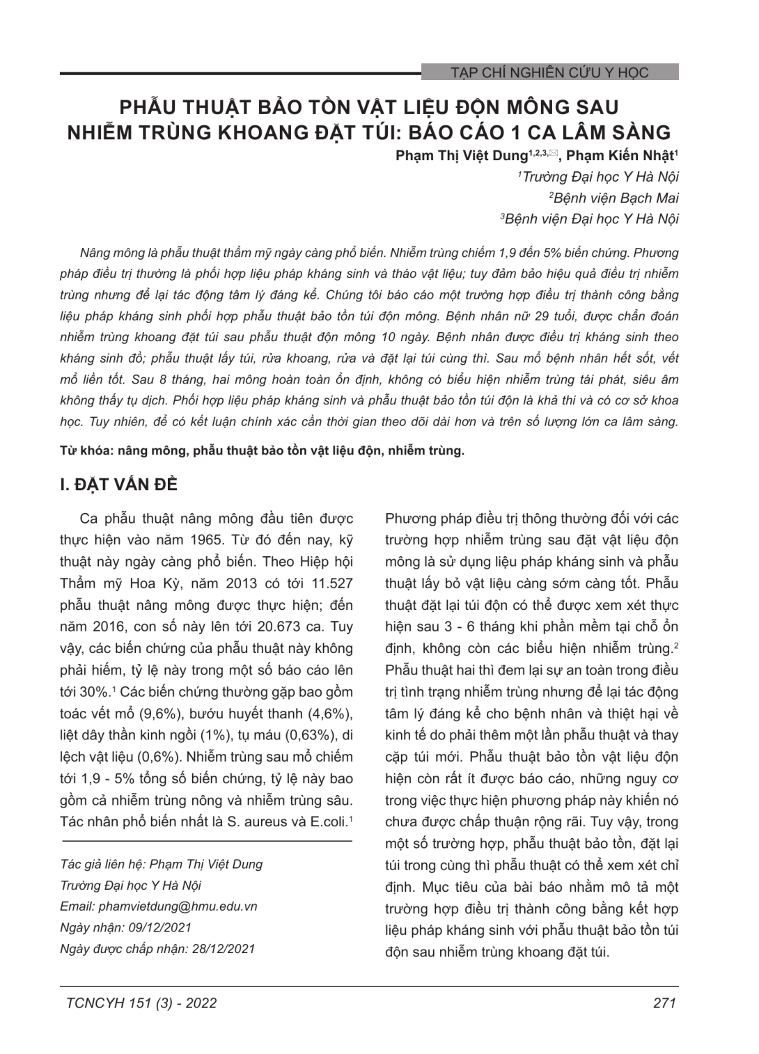 Nâng mông là phẫu thuật thẩm mỹ ngày càng phổ biến. Nhiễm trùng chiếm 1,9 đến 5% biến chứng. Phương pháp điều trị thường là phối hợp liệu pháp kháng sinh và tháo vật liệu; tuy đảm bảo hiệu quả điều trị nhiễm trùng nhưng để lại tác động tâm lý đáng kể. Chúng tôi báo cáo một trường hợp điều trị thành công bằng liệu pháp kháng sinh phối hợp phẫu thuật bảo tồn túi độn mông. Bệnh nhân nữ 29 tuổi, được chẩn đoán nhiễm trùng khoang đặt túi sau phẫu thuật độn mông 10 ngày. Bệnh nhân được điều trị kháng sinh theo kháng sinh đồ; phẫu thuật lấy túi, rửa khoang, rửa và đặt lại túi cùng thì. Sau mổ bệnh nhân hết sốt, vết mổ liền tốt. Sau 8 tháng, hai mông hoàn toàn ổn định, không có biểu hiện nhiễm trùng tái phát, siêu âm không thấy tụ dịch. Phối hợp liệu pháp kháng sinh và phẫu thuật bảo tồn túi độn là khả thi và có cơ sở khoa học. Tuy nhiên, để có kết luận chính xác cần thời gian theo dõi dài hơn và trên số lượng lớn ca lâm sàng.