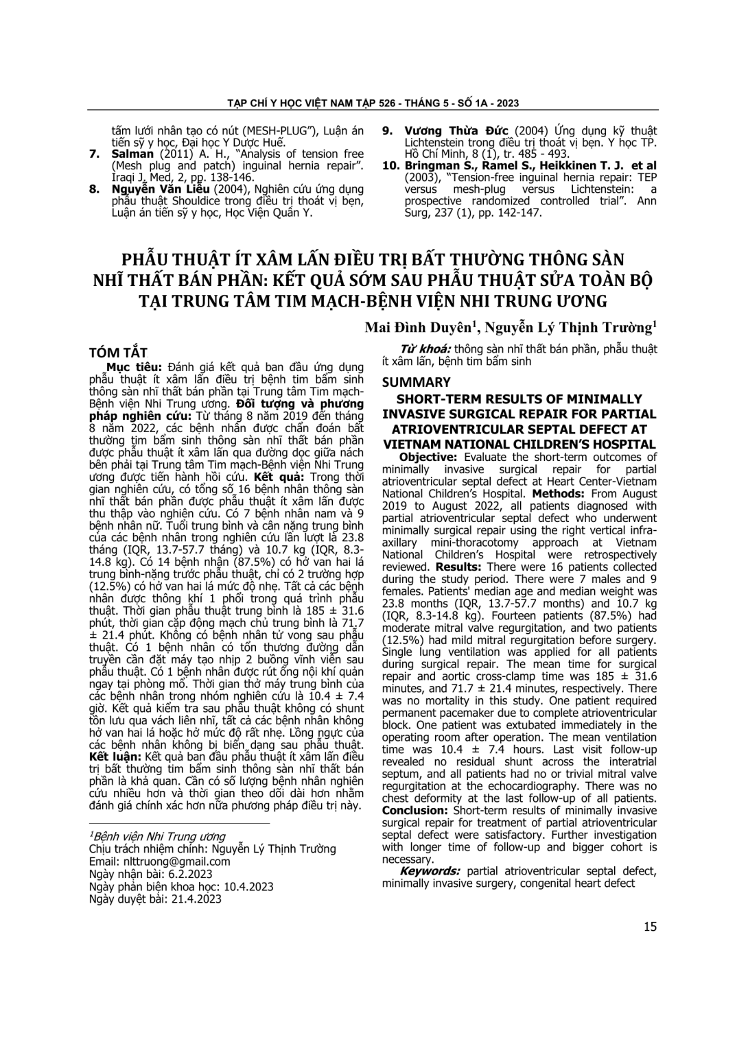 Đánh giá kết quả ban đầu ứng dụng phẫu thuật ít xâm lấn điều trị bệnh tim bẩm sinh thông sàn nhĩ thất bán phần tại Trung tâm Tim mạch-Bệnh viện Nhi Trung ương. Đối tượng và phương pháp nghiên cứu: Từ tháng 8 năm 2019 đến tháng 8 năm 2022, các bệnh nhân được chẩn đoán bất thường tim bẩm sinh thông sàn nhĩ thất bán phần được phẫu thuật ít xâm lấn qua đường dọc giữa nách bên phải tại Trung tâm Tim mạch-Bệnh viện Nhi Trung ương được tiến hành hồi cứu. Kết quả: Trong thời gian nghiên cứu, có tổng số 16 bệnh nhân thông sàn nhĩ thất bán phần được phẫu thuật ít xâm lấn được thu thập vào nghiên cứu. Có 7 bệnh nhân nam và 9 bệnh nhân nữ. Tuổi trung bình và cân nặng trung bình của các bệnh nhân trong nghiên cứu lần lượt là 23.8 tháng (IQR, 13.7-57.7 tháng) và 10.7 kg (IQR, 8.3-14.8 kg). Có 14 bệnh nhân (87.5%) có hở van hai lá trung bình-nặng trước phẫu thuật, chỉ có 2 trường hợp (12.5%) có hở van hai lá mức độ nhẹ. Tất cả các bệnh nhân được thông khí 1 phổi trong quá trình phẫu thuật. Thời gian phẫu thuật trung bình là 185 ± 31.6 phút, thời gian cặp động mạch chủ trung bình là 71.7 ± 21.4 phút. Không có bệnh nhân tử vong sau phẫu thuật. Có 1 bệnh nhân có tổn thương đường dẫn truyền cần đặt máy tạo nhịp 2 buồng vĩnh viễn sau phẫu thuật. Có 1 bệnh nhân được rút ống nội khí quản ngay tại phòng mổ. Thời gian thở máy trung bình của các bệnh nhân trong nhóm nghiên cứu là 10.4 ± 7.4 giờ. Kết quả kiểm tra sau phẫu thuật không có shunt tồn lưu qua vách liên nhĩ, tất cả các bệnh nhân không hở van hai lá hoặc hở mức độ rất nhẹ. Lồng ngực của các bệnh nhân không bị biến dạng sau phẫu thuật. Kết luận: Kết quả ban đầu phẫu thuật ít xâm lấn điều trị bất thường tim bẩm sinh thông sàn nhĩ thất bán phần là khả quan. Cần có số lượng bệnh nhân nghiên cứu nhiều hơn và thời gian theo dõi dài hơn nhằm đánh giá chính xác hơn nữa phương pháp điều trị này.
