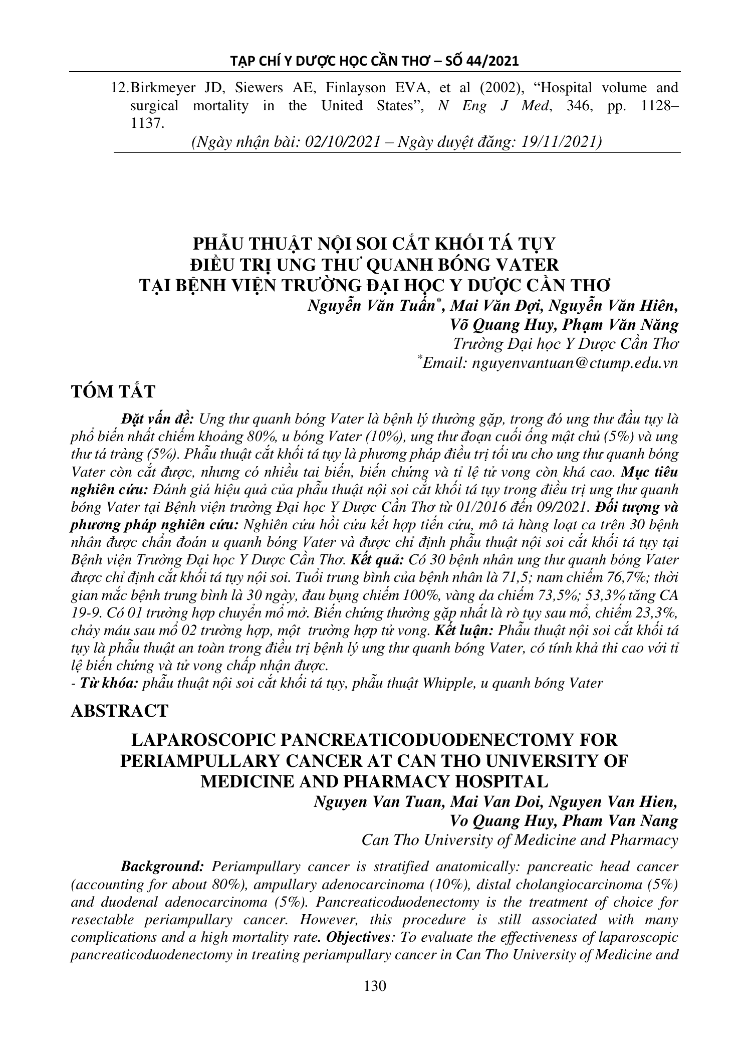 Ung thư quanh bóng Vater là bệnh lý thường gặp, trong đó ung thư đầu tụy là phổ biến nhất chiếm khoảng 80%, u bóng Vater (10%), ung thư đoạn cuối ống mật chủ (5%) và ung thư tá tràng (5%). Phẫu thuật cắt khối tá tụy là phương pháp điều trị tối ưu cho ung thư quanh bóng Vater còn cắt được, nhưng có nhiều tai biến, biến chứng và tỉ lệ tử vong còn khá cao. Mục tiêu nghiên cứu: Đánh giá hiệu quả của phẫu thuật nội soi cắt khối tá tụy trong điều trị ung thư quanh bóng Vater tại Bệnh viện trường Đại học Y Dược Cần Thơ từ 01/2016 đến 09/2021. Đối tượng và phương pháp nghiên cứu: Nghiên cứu hồi cứu kết hợp tiến cứu, mô tả hàng loạt ca trên 30 bệnh nhân được chẩn đoán u quanh bóng Vater và được chỉ định phẫu thuật nội soi cắt khối tá tụy tại Bệnh viện Trường Đại học Y Dược Cần Thơ. Kết quả: Có 30 bệnh nhân ung thư quanh bóng Vater được chỉ định cắt khối tá tụy nội soi. Tuổi trung bình của bệnh nhân là 71,5; nam chiếm 76,7%; thời gian mắc bệnh trung bình là 30 ngày, đau bụng chiếm 100%, vàng da chiếm 73,5%; 53,3% tăng CA 19-9. Có 01 trường hợp chuyển mổ mở. Biến chứng thường gặp nhất là rò tụy sau mổ, chiếm 23,3%, chảy máu sau mổ 02 trường hợp, một trường hợp tử vong. Kết luận: Phẫu thuật nội soi cắt khối tá tụy là phẫu thuật an toàn trong điều trị bệnh lý ung thư quanh bóng Vater, có tính khả thi cao với tỉ lệ biến chứng và tử vong chấp nhận được.