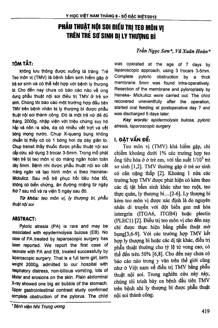 Pyloric atresia (PA) is rare and may be associated with epidermolysis bulosa (EB). No case of PA.treated by laparoscopic surgery has been reported. The authors report the first case of neonate with PA and ES, treated successfully by laparoscopic surgery. That is a full term girl, birth weight 2000g, admitted to our hospital with respiratory distress, non-bilious vomiting, lots of blister and erosions on the skin. Plain abdominal X-ray showed one big air bubble of the stomach. Upper gastrointestinal contrast study confirmed complete obstruction of the pylorus. The child was operated at the age of 7 days by laparoscopic approach, using 3 trocars 3-5mm. Complete pyloric obstruction by a thick membrane 5mm was found intra-operatively. Resection of the membrane and pyloroplasty by Heneke-Mickulicz were carried out. The child recovered uneventfully after the operation, started oral feeding at postoperative day 7 and was discharged 5 days later.