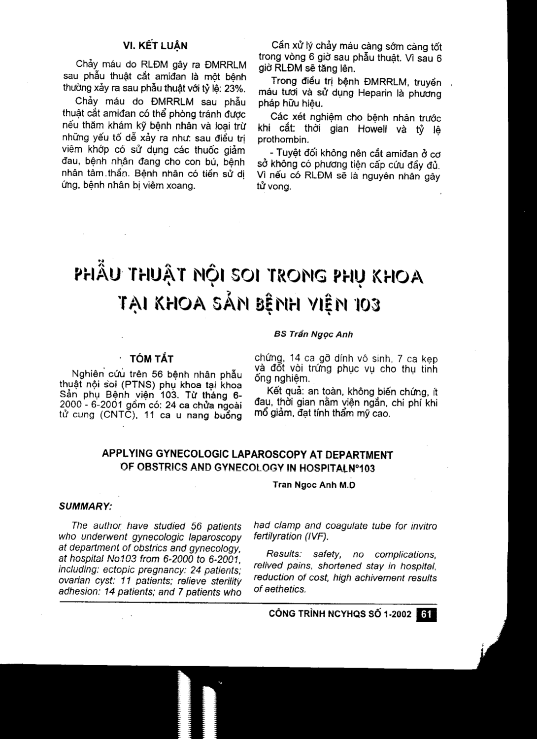 Nghiên cứu trên 56 bệnh nhân phẫu thuật nội soi (PTNS) phụ khoa tại khoa sản phụ bệnh viện 103. Từ tháng 6/2000-6/2002 gồm có: 24 ca chửa ngoài tử cung, 11 ca u nang buồng trứng, 14 ca gỡ dính vô sinh, 7 ca kẹp và đốt vòi trứng phục vụ thụ tinh ống nghiệm. Kết quả: an toàn, không biến chứng, ít đau, thời gian nằm viện ngắn, chi phí khi mổ giảm, đạt tính thẩm mỹ cao.
