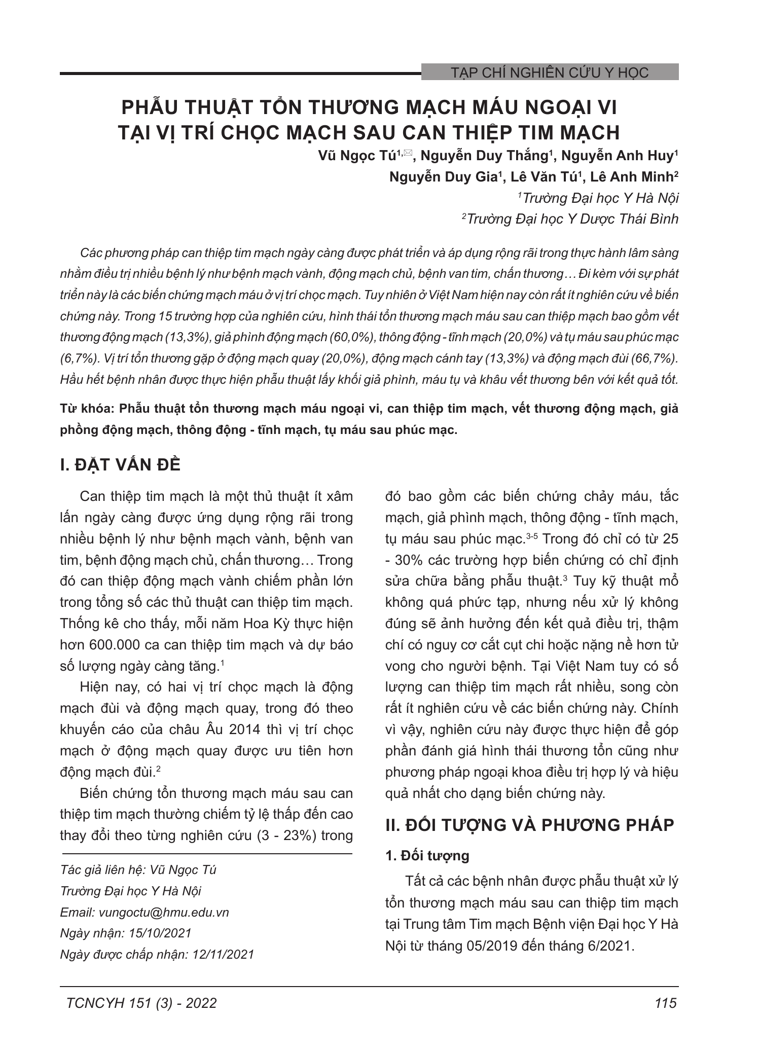 Các phương pháp can thiệp tim mạch ngày càng được phát triển và áp dụng rộng rãi trong thực hành lâm sàng nhằm điều trị nhiều bệnh lý như bệnh mạch vành, động mạch chủ, bệnh van tim, chấn thương… Đi kèm với sự phát triển này là các biến chứng mạch máu ở vị trí chọc mạch. Tuy nhiên ở Việt Nam hiện nay còn rất ít nghiên cứu về biến chứng này. Trong 15 trường hợp của nghiên cứu, hình thái tổn thương mạch máu sau can thiệp mạch bao gồm vết thương động mạch (13,3%), giả phình động mạch (60,0%), thông động - tĩnh mạch (20,0%) và tụ máu sau phúc mạc (6,7%). Vị trí tổn thương gặp ở động mạch quay (20,0%), động mạch cánh tay (13,3%) và động mạch đùi (66,7%). Hầu hết bệnh nhân được thực hiện phẫu thuật lấy khối giả phình, máu tụ và khâu vết thương bên với kết quả tốt.