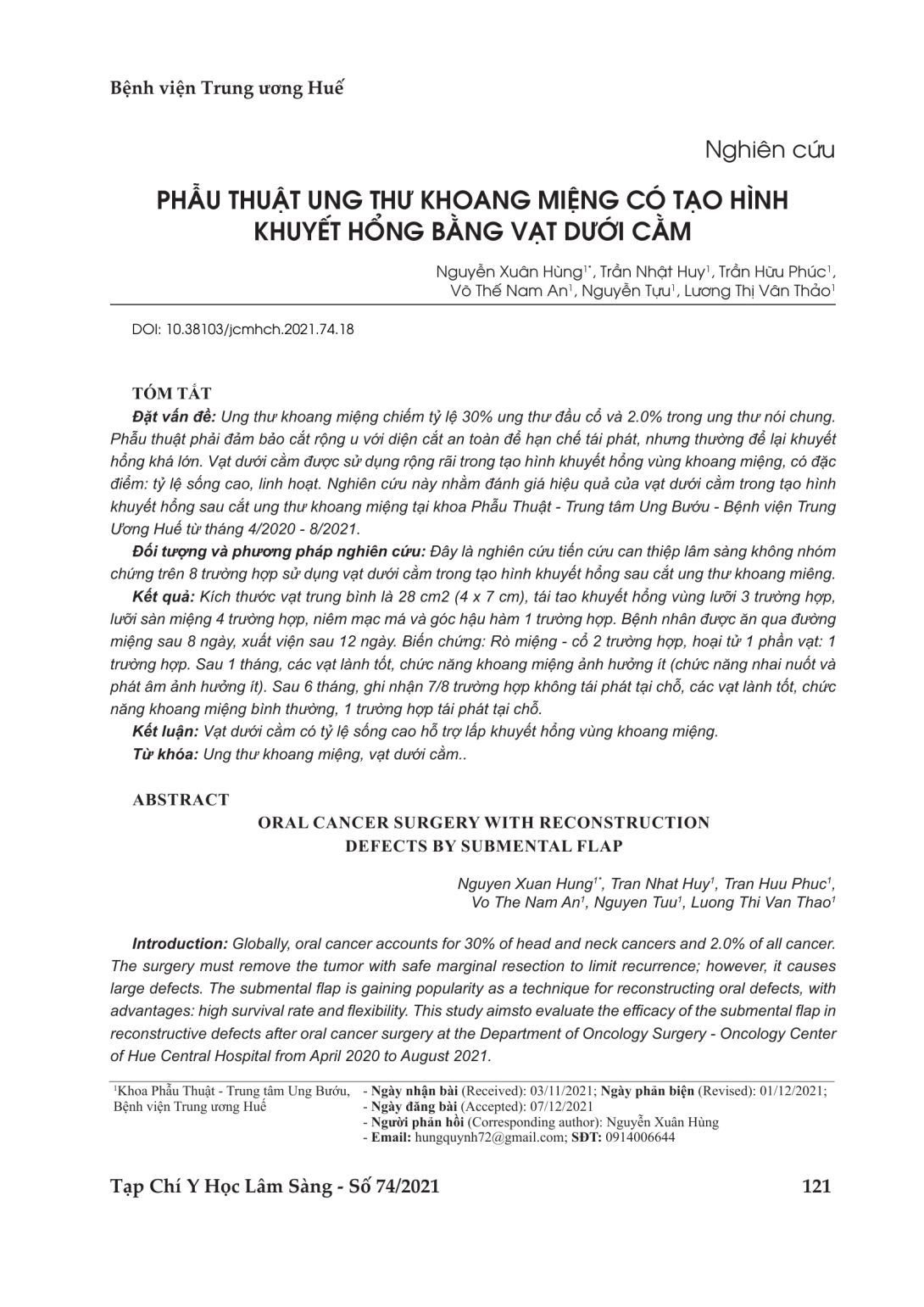 Ung thư khoang miệng chiếm tỷ lệ 30% ung thư đầu cổ và 2.0% trong ung thư nói chung. Phẫu thuật phải đảm bảo cắt rộng u với diện cắt an toàn để hạn chế tái phát, nhưng thường để lại khuyết hổng khá lớn. Vạt dưới cằm được sử dụng rộng rãi trong tạo hình khuyết hổng vùng khoang miệng, có đặc điểm: tỷ lệ sống cao, linh hoạt. Nghiên cứu này nhằm đánh giá hiệu quả của vạt dưới cằm trong tạo hình khuyết hổng sau cắt ung thư khoang miệng tại khoa Phẫu Thuật - Trung tâm Ung Bướu - Bệnh viện Trung Ương Huế từ tháng 4/2020 - 8/2021. Đây là nghiên cứu tiến cứu can thiệp lâm sàng không nhóm chứng trên 8 trường hợp sử dụng vạt dưới cằm trong tạo hình khuyết hổng sau cắt ung thư khoang miêng. Kích thước vạt trung bình là 28 cm2 (4 x 7 cm), tái tao khuyết hổng vùng lưỡi 3 trường hợp, lưỡi sàn miệng 4 trường hợp, niêm mạc má và góc hậu hàm 1 trường hợp. Bệnh nhân được ăn qua đường miệng sau 8 ngày, xuất viện sau 12 ngày. Biến chứng: Rò miệng - cổ 2 trường hợp, hoại tử 1 phần vạt: 1 trường hợp. Sau 1 tháng, các vạt lành tốt, chức năng khoang miệng ảnh hưởng ít (chức năng nhai nuốt và phát âm ảnh hưởng ít). Sau 6 tháng, ghi nhận 7/8 trường hợp không tái phát tại chỗ, các vạt lành tốt, chức năng khoang miệng bình thường, 1 trường hợp tái phát tại chỗ. Vạt dưới cằm có tỷ lệ sống cao hỗ trợ lấp khuyết hổng vùng khoang miệng.