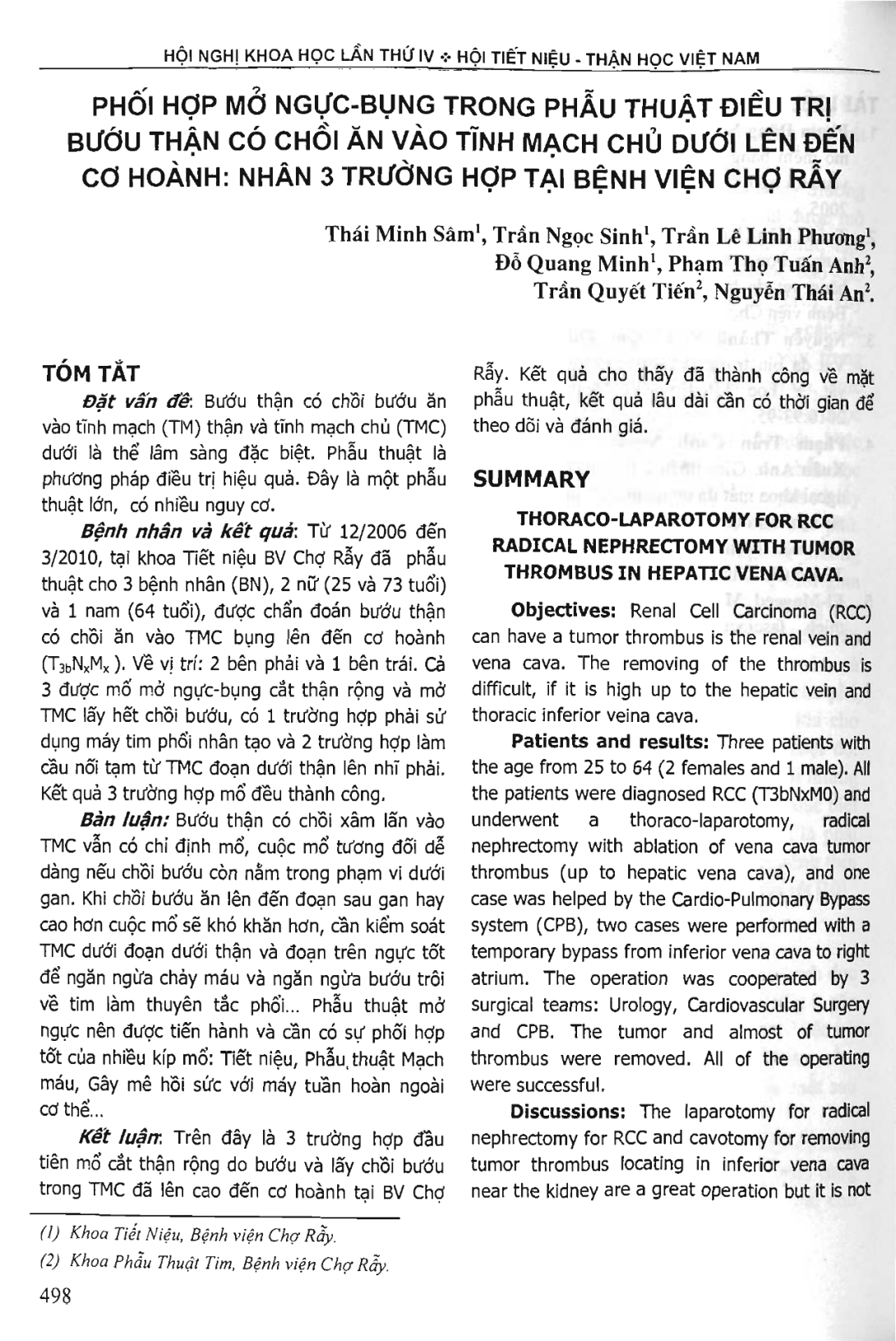 Phối hợp mở ngực - bụng trong phẫu thuật điều trị bướu thận có chồi ăn vào tĩnh mạch chủ dưới lên đến cơ hoành: nhân 3 trường hợp tại bênh viện Chợ Rẫy