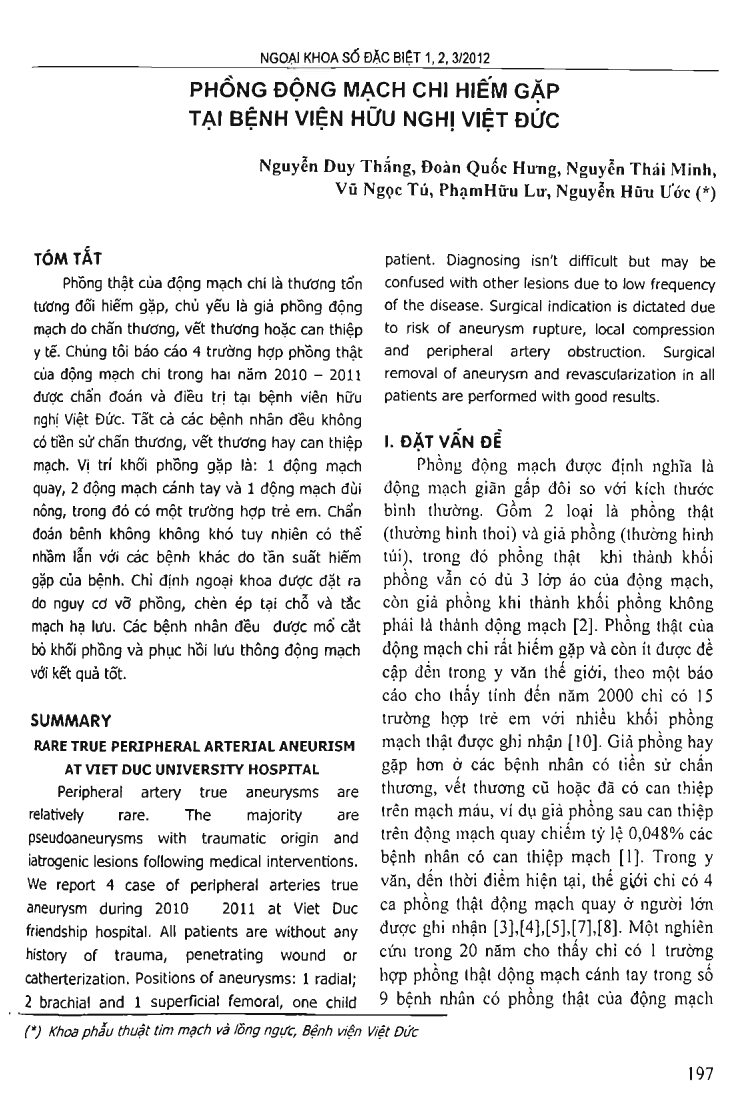 Peripheral artery true aneurysms are relatively rare. The majority are pseudoaneurysms with traumatic origin and iatrogenic lesions following medical interventions. The report on 4 case of peripheral arteries true aneurysm during 2010-2011 at Viet Duc Hospital. All patients are without any history of trauma, penetrating wound or catherterization. Positions of aneurysms: 1 radial; 2 brachial and 1 superficial femoral, one child patient. Diagnosing isn't difficult but may be confused with other lesions due to low frequency of the disease. Surgical indication is dictated due to risk of aneurysm rupture, local compression and peripheral artery obstruction. Surgical removal of aneurysm and revascularization in all patients are performed with good results.