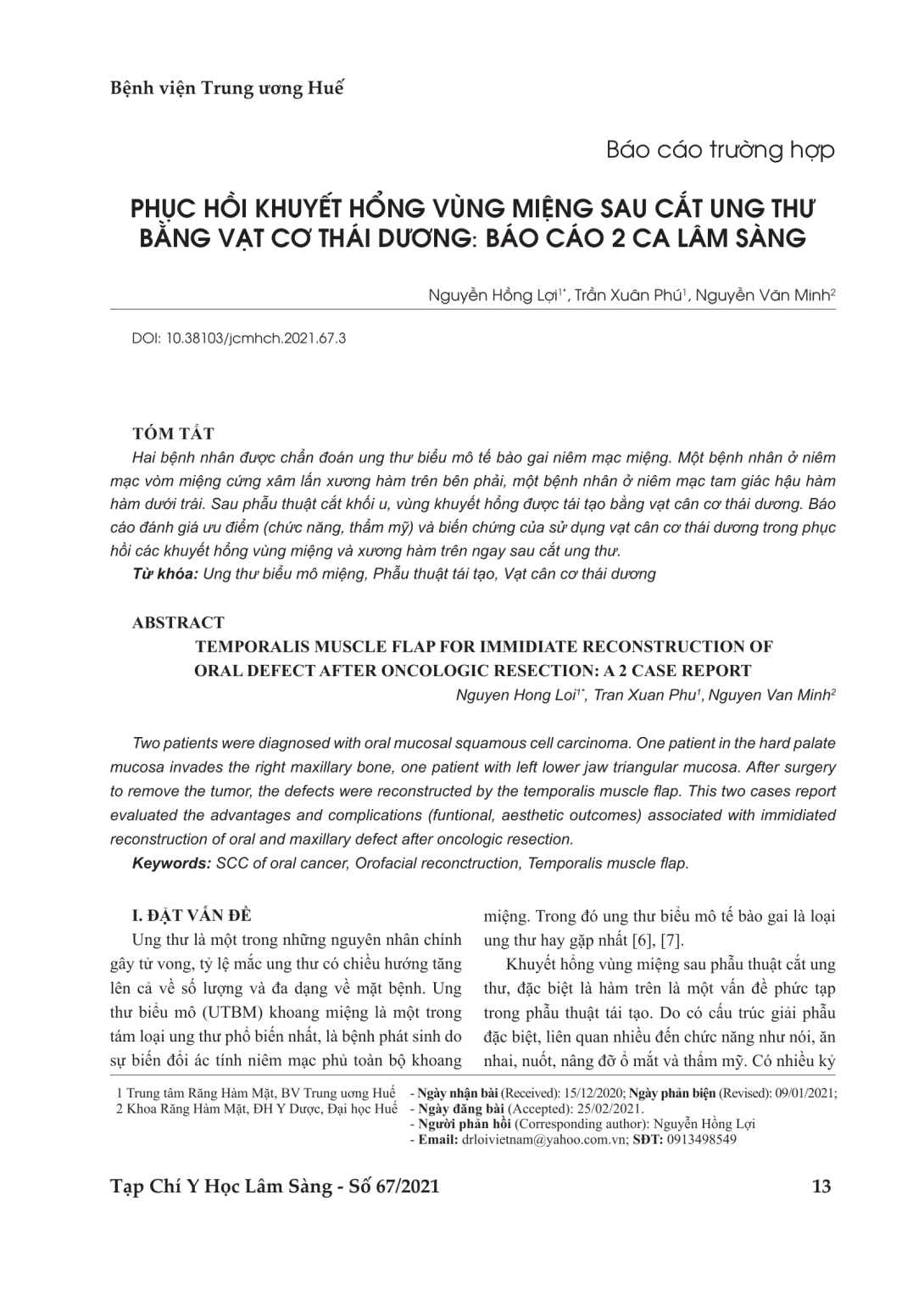 Hai bệnh nhân được chẩn đoán ung thư biểu mô tế bào gai niêm mạc miệng. Một bệnh nhân ở niêm mạc vòm miệng cứng xâm lấn xương hàm trên bên phải, một bệnh nhân ở niêm mạc tam giác hậu hàm hàm dưới trái. Sau phẫu thuật cắt khối u, vùng khuyết hổng được tái tạo bằng vạt cân cơ thái dương. Báo cáo đánh giá ưu điểm (chức năng, thẩm mỹ) và biến chứng của sử dụng vạt cân cơ thái dương trong phục hồi các khuyết hổng vùng miệng và xương hàm trên ngay sau cắt ung thư.