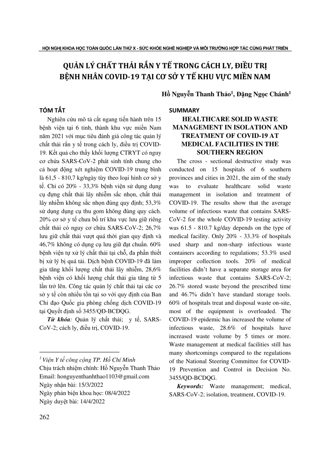 The cross - sectional destructive study was conducted on 15 hospitals of 6 southern provinces and cities in 2021, the aim of the study was to evaluate healthcare solid waste management in isolation and treatment of COVID-19. The results show that the average volume of infectious waste that contains SARS-CoV-2 for the whole COVID-19 testing activity was 61.5 - 810.7 kg/day depends on the type of medical facility. Only 20% - 33.3% of hospitals used sharp and non-sharp infectious waste containers according to regulations; 53.3% used improper collection tools. 20% of medical facilities didn’t have a separate storage area for infectious waste that contains SARS-CoV-2; 26.7% stored waste beyond the prescribed time and 46.7% didn’t have standard storage tools. 60% of hospitals treat and disposal waste on-site, most of the equipment is overloaded. The COVID-19 epidemic has increased the volume of infectious waste, 28.6% of hospitals have increased waste volume by 5 times or more. Waste management at medical facilities still has many shortcomings compared to the regulations of the National Steering Committee for COVID-19 Prevention and Control in Decision No. 3455/QD-BCDQG.