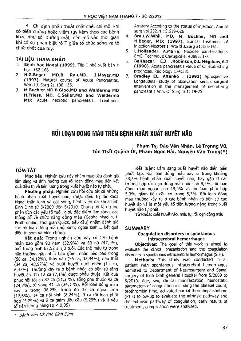 Objectives: The goal of this work is aimed to evaluate the dinical presentation and the coagulation disorders in spontanous intracerebral hemorrhages (SIH). Methods: This study was conducted in all patient with spontanous intracerebral hemorrhages admitted to Department of Neurosurgery and Spinal surgery of Binh Dinh general Hospital from 5/2009 to 5/2010. Age, sex, clinical manifestation, hemostatic parameters of coagulation including the platelet count, prothrombin time, activated partial thromboplastintime (PTT) follow-up to evaluate the intrinsic pathway and the extrinsic pathway of coagulation, early results of treatment, complication were analysed. Results: There were 170 patients: 90 male (52,9 percent) and 80 female (47,1 percent), mean age was 62,52 :t 1,32 year-old. The most common type of sIH were lenticulostriate in 58 cases (34,12 percent), lobar in 56 cases (32,94 percent), intraventriculare 34 cases (48,57 percent), subarachnoid 11 cases (6,47 percent). Coagulation disorders followed-up spontanous intracerebral hemorrhages in 65 cases (38,2 percent). The diffrence of he frequency of coagulation disturbances in the various type of SIH were statistically no significant. The disfunction of the extrinsic pathway occurred in 33 cases (17,65 percent), intrinsic pathway were in 14 cases (8,24 percent), mixed 9 cases (5,29 percent), decrease platelet count was in 9 cases (5,29 percent). Medical history of arterial hypertension appeared to be relacted factor with coagulation disorder in spontanous intracerebral hemorrhages and the coagulation disorder associate more frequent in the poor results than others. Surgical lesions were in 12 cases (7,1 percent), good result were in 87 cases (51,2 percent), morbility was in 24,7 percent and mortality in 24,1 percent. Conclusion: Clinical presentation of spontanous intracerebral hemorrhages were complicated. The coagulation disorder occurred in 38,2 percent cases. The most frequent kind of coagulation disturbances were disfunction of extrinsic pathway in 33 cases (17,65 percent), of intrinsic pathway in 14 cases (8,24 percent), mix in 9 cases (5,4 percent), decreased platelet count in 9 cases (5,4 percent). The coagulation disorder occured more common, in the patient with medical history of arterial hypertension than the others and seemed to be a poor prognostic factor.