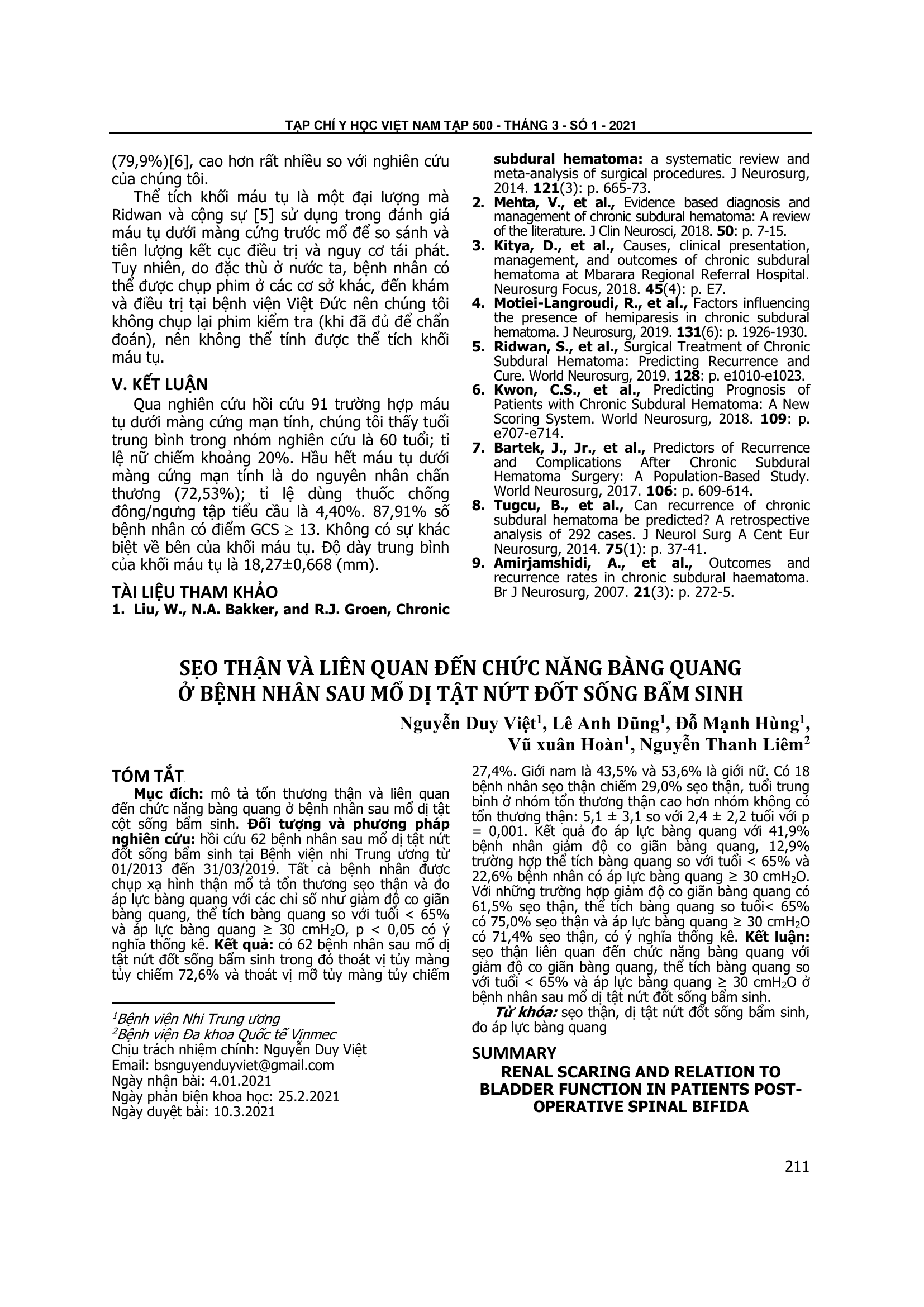 Mô tả tổn thương thận và liên quan đến chức năng bàng quang ở bệnh nhân sau mổ dị tật cột sống bẩm sinh. Đối tượng và phương pháp nghiên cứu: hồi cứu 62 bệnh nhân sau mổ dị tật nứt đốt sống bẩm sinh tại Bệnh viện nhi Trung ương từ 01/2013 đến 31/03/2019. Tất cả bệnh nhân được chụp xạ hình thận mổ tả tổn thương sẹo thận và đo áp lực bàng quang với các chỉ số như giảm độ co giãn bàng quang, thể tích bàng quang so với tuổi < 65% và áp lực bàng quang ≥ 30 cmH2O, p < 0,05 có ý nghĩa thống kê. Kết quả: có 62 bệnh nhân sau mổ dị tật nứt đốt sống bẩm sinh trong đó thoát vị tủy màng tủy chiếm 72,6% và thoát vị mỡ tủy màng tủy chiếm 27,4%. Giới nam là 43,5% và 53,6% là giới nữ. Có 18 bệnh nhân sẹo thận chiếm 29,0% sẹo thận, tuổi trung bình ở nhóm tổn thương thận cao hơn nhóm không có tổn thương thận: 5,1 ± 3,1 so với 2,4 ± 2,2 tuổi với p = 0,001. Kết quả đo áp lực bàng quang với 41,9% bệnh nhân giảm độ co giãn bàng quang, 12,9% trường hợp thể tích bàng quang so với tuổi < 65% và 22,6% bệnh nhân có áp lực bàng quang ≥ 30 cmH2O. Với những trường hợp giảm độ co giãn bàng quang có 61,5% sẹo thận, thể tích bàng quang so tuổi< 65% có 75,0% sẹo thận và áp lực bàng quang ≥ 30 cmH2O có 71,4% sẹo thận, có ý nghĩa thống kê. Kết luận: sẹo thận liên quan đến chức năng bàng quang với giảm độ co giãn bàng quang, thể tích bàng quang so với tuổi < 65% và áp lực bàng quang ≥ 30 cmH2O ở bệnh nhân sau mổ dị tật nứt đốt sống bẩm sinh.