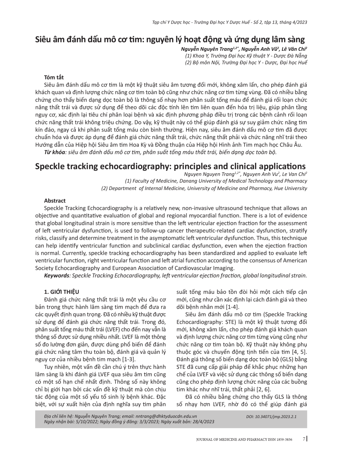 Siêu âm đánh dấu mô cơ tim là một kỹ thuật siêu âm tương đối mới, không xâm lấn, cho phép đánh giá khách quan và định lượng chức năng cơ tim toàn bộ cũng như chức năng cơ tim từng vùng. Đã có nhiều bằng chứng cho thấy biến dạng dọc toàn bộ là thông số nhạy hơn phân suất tống máu để đánh giá rối loạn chức năng thất trái và được sử dụng để theo dõi các độc tính lên tim liên quan đến hóa trị liệu, giúp phân tầng nguy cơ, xác định lại tiêu chí phân loại bệnh và xác định phương pháp điều trị trong các bệnh cảnh rối loạn chức năng thất trái không triệu chứng. Do vậy, kỹ thuật này có thể giúp đánh giá sự suy giảm chức năng tim kín đáo, ngay cả khi phân suất tống máu còn bình thường. Hiện nay, siêu âm đánh dấu mô cơ tim đã được chuẩn hóa và được áp dụng để đánh giá chức năng thất trái, chức năng thất phải và chức năng nhĩ trái theo Hướng dẫn của Hiệp hội Siêu âm tim Hoa Kỳ và Đồng thuận của Hiệp hội Hình ảnh Tim mạch học Châu Âu.