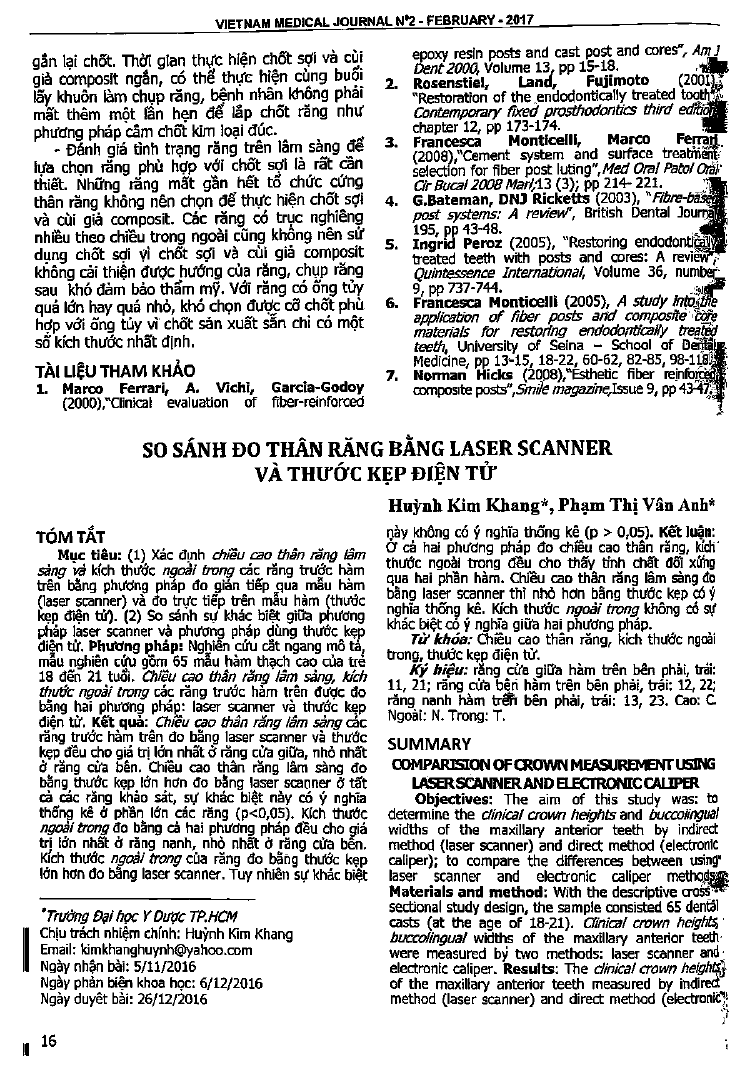 Xác định chiều cao thân răng lâm sàng và kích thước ngoài trong các răng trước hàm trên bằng phương pháp đo gián tiếp qua mẫu hàm (laser scanner) và đo trực tiếp trên mẫu hàm (thước kẹp điện tử) trên 65 mẫu hàm thạch cao của trẻ từ 18-21 tuổi. Chiều cao thân răng lâm sàng các răng trước hàm trên đo bằng laser scanner và thước kẹp đều có giá trị lớn nhất ở răng cửa giữa và nhỏ nhất ở răng cửa bên. Chiều cao thân răng lâm sàng đo bằng thước kẹp điện tử lớn hơn đo bằng laser scanner ở tất cả các răng khảo sát. Kích thước ngoài trong ở tất cả các răng khảo sát đều cho kết quả lớn nhất ở răng nanh, nhỏ nhất ở răng cửa bên.