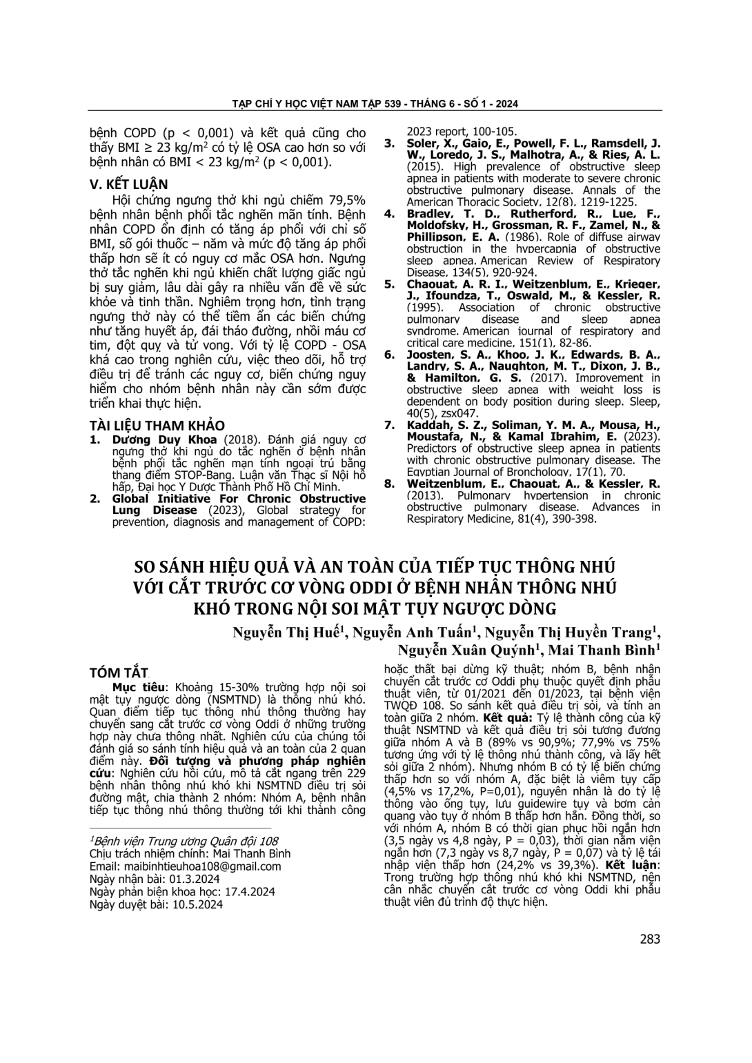 Khoảng 15-30% trường hợp nội soi mật tụy ngược dòng (NSMTND) là thông nhú khó. Quan điểm tiếp tục thông nhú thông thường hay chuyển sang cắt trước cơ vòng Oddi ở những trường hợp này chưa thông nhất. Nghiên cứu của chúng tôi đánh giá so sánh tính hiệu quả và an toàn của 2 quan điểm này. Đối tượng và phương pháp nghiên cứu: Nghiên cứu hồi cứu, mô tả cắt ngang trên 229 bệnh nhân thông nhú khó khi NSMTND điều trị sỏi đường mật, chia thành 2 nhóm: Nhóm A, bệnh nhân tiếp tục thông nhú thông thường tới khi thành công hoặc thất bại dừng kỹ thuật; nhóm B, bệnh nhân chuyển cắt trước cơ Oddi phụ thuộc quyết định phẫu thuật viên, từ 01/2021 đến 01/2023, tại bệnh viện TWQĐ 108. So sánh kết quả điều trị sỏi, và tính an toàn giữa 2 nhóm. Kết quả: Tỷ lệ thành công của kỹ thuật NSMTND và kết quả điều trị sỏi tương đương giữa nhóm A và B (89% vs 90,9%; 77,9% vs 75% tương ứng với tỷ lệ thông nhú thành công, và lấy hết sỏi giữa 2 nhóm). Nhưng nhóm B có tỷ lệ biến chứng thấp hơn so với nhóm A, đặc biệt là viêm tụy cấp (4,5% vs 17,2%, P=0,01), nguyên nhân là do tỷ lệ thông vào ống tụy, lưu guidewire tụy và bơm cản quang vào tụy ở nhóm B thấp hơn hẳn. Đồng thời, so với nhóm A, nhóm B có thời gian phục hồi ngắn hơn (3,5 ngày vs 4,8 ngày, P = 0,03), thời gian nằm viện ngắn hơn (7,3 ngày vs 8,7 ngày, P = 0,07) và tỷ lệ tái nhập viện thấp hơn (24,2% vs 39,3%). Kết luận: Trong trường hợp thông nhú khó khi NSMTND, nên cân nhắc chuyển cắt trước cơ vòng Oddi khi phẫu thuật viên đủ trình độ thực hiện.