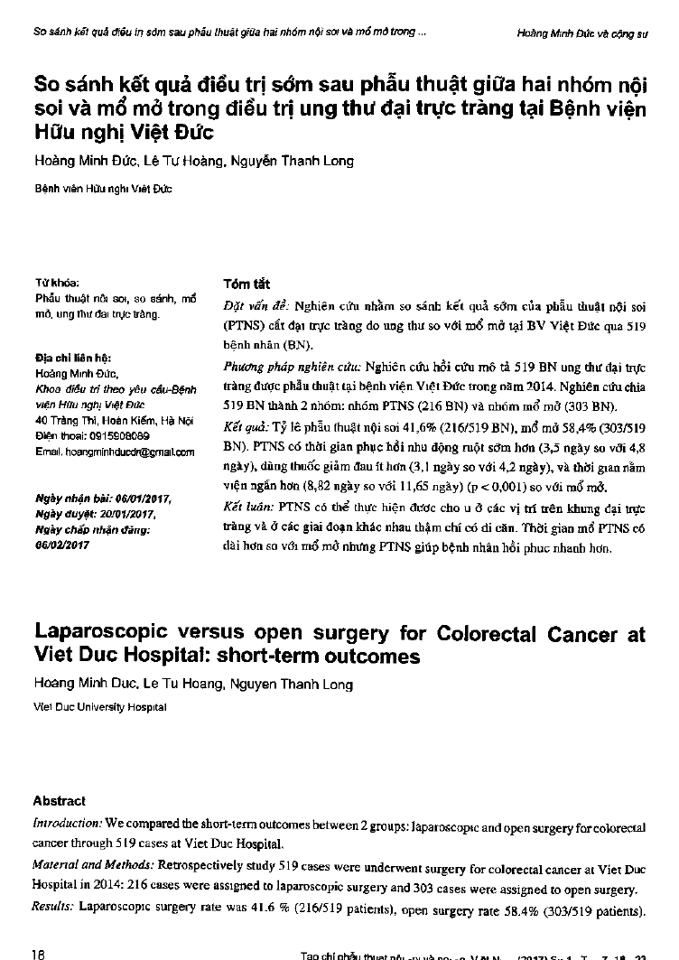 So sánh kết quả điều trị sớm sau phẫu thuật giữa hai nhóm nội soi và mổ mở trong điều trị ung thư đại trực tràng tại bệnh viện Hữu nghị Việt Đức
