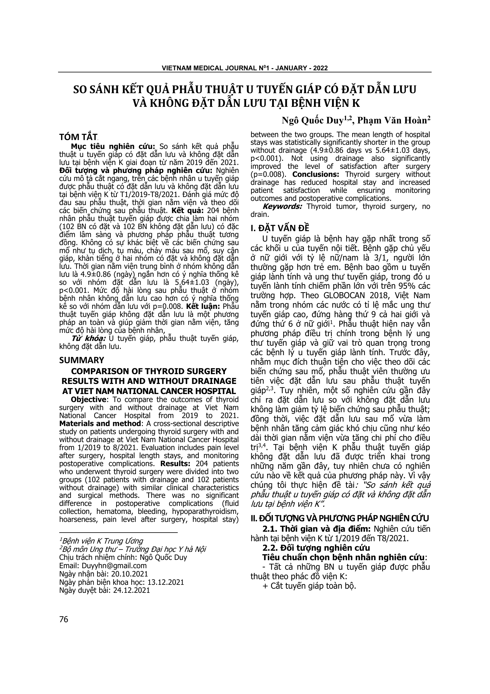 So sánh kết quả phẫu thuật u tuyến giáp có đặt dẫn lưu và không đặt dẫn lưu tại bệnh viện K giai đoạn từ năm 2019 đến 2021. Đối tượng và phương pháp nghiên cứu: Nghiên cứu mô tả cắt ngang, trên các bệnh nhân u tuyến giáp được phẫu thuật có đặt dẫn lưu và không đặt dẫn lưu tại bệnh viện K từ T1/2019-T8/2021. Đánh giá mức độ đau sau phẫu thuật, thời gian nằm viện và theo dõi các biến chứng sau phẫu thuật. Kết quả: 204 bệnh nhân phẫu thuật tuyến giáp được chia làm hai nhóm (102 BN có đặt và 102 BN không đặt dẫn lưu) có đặc điểm lâm sàng và phương pháp phẫu thuật tương đồng. Không có sự khác biệt về các biến chứng sau mổ như tụ dịch, tụ máu, chảy máu sau mổ, suy cận giáp, khàn tiếng ở hai nhóm có đặt và không đặt dẫn lưu. Thời gian nằm viện trung bình ở nhóm không dẫn lưu là 4.9±0.86 (ngày) ngắn hơn có ý nghĩa thống kê so với nhóm đặt dẫn lưu là 5.64±1.03 (ngày), p<0.001. Mức độ hài lòng sau phẫu thuật ở nhóm bệnh nhân không dẫn lưu cao hơn có ý nghĩa thống kê so với nhóm dẫn lưu với p=0.008. Kết luận: Phẫu thuật tuyến giáp không đặt dẫn lưu là một phương pháp an toàn và giúp giảm thời gian nằm viện, tăng mức độ hài lòng của bệnh nhân,