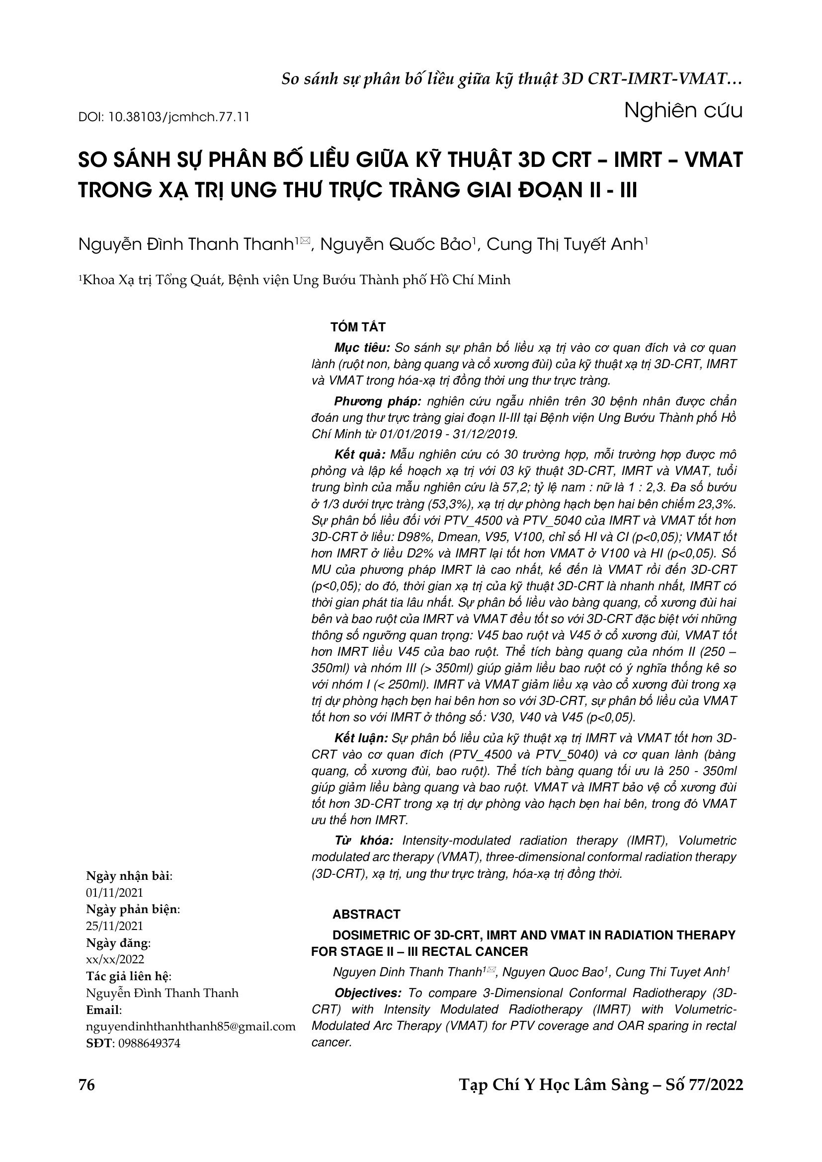 So sánh sự phân bố liều xạ trị vào cơ quan đích và cơ quan lành (ruột non, bàng quang và cổ xương đùi) của kỹ thuật xạ trị 3D-CRT, IMRT và VMAT trong hóa-xạ trị đồng thời ung thư trực tràng. Phương pháp: nghiên cứu ngẫu nhiên trên 30 bệnh nhân được chẩn đoán ung thư trực tràng giai đoạn II-III tại Bệnh viện Ung Bướu Thành phố Hồ Chí Minh từ 01/01/2019 - 31/12/2019. Kết quả: Mẫu nghiên cứu có 30 trường hợp, mỗi trường hợp được mô phỏng và lập kế hoạch xạ trị với 03 kỹ thuật 3D-CRT, IMRT và VMAT, tuổi trung bình của mẫu nghiên cứu là 57,2; tỷ lệ nam : nữ là 1 : 2,3. Đa số bướu ở 1/3 dưới trực tràng (53,3%), xạ trị dự phòng hạch bẹn hai bên chiếm 23,3%. Sự phân bố liều đối với PTV_4500 và PTV_5040 của IMRT và VMAT tốt hơn 3D-CRT ở liều: D98%, Dmean, V95, V100, chỉ số HI và CI (p<0,05); VMAT tốt hơn IMRT ở liều D2% và IMRT lại tốt hơn VMAT ở V100 và HI (p<0,05). Số MU của phương pháp IMRT là cao nhất, kế đến là VMAT rồi đến 3D-CRT (p<0,05); do đó, thời gian xạ trị của kỹ thuật 3D-CRT là nhanh nhất, IMRT có thời gian phát tia lâu nhất. Sự phân bố liều vào bàng quang, cổ xương đùi hai bên và bao ruột của IMRT và VMAT đều tốt so với 3D-CRT đặc biệt với những thông số ngưỡng quan trọng: V45 bao ruột và V45 ở cổ xương đùi, VMAT tốt hơn IMRT liều V45 của bao ruột. Thể tích bàng quang của nhóm II (250 – 350ml) và nhóm III (> 350ml) giúp giảm liều bao ruột có ý nghĩa thống kê so với nhóm I (< 250ml). IMRT và VMAT giảm liều xạ vào cổ xương đùi trong xạ trị dự phòng hạch bẹn hai bên hơn so với 3D-CRT, sự phân bố liều của VMAT tốt hơn so với IMRT ở thông số: V30, V40 và V45 (p<0,05). Kết luận: Sự phân bố liều của kỹ thuật xạ trị IMRT và VMAT tốt hơn 3D-CRT vào cơ quan đích (PTV_4500 và PTV_5040) và cơ quan lành (bàng quang, cổ xương đùi, bao ruột). Thể tích bàng quang tối ưu là 250 - 350ml giúp giảm liều bàng quang và bao ruột. VMAT và IMRT bảo vệ cổ xương đùi tốt hơn 3D-CRT trong xạ trị dự phòng vào hạch bẹn hai bên, trong đó VMAT ưu thế hơn IMRT.