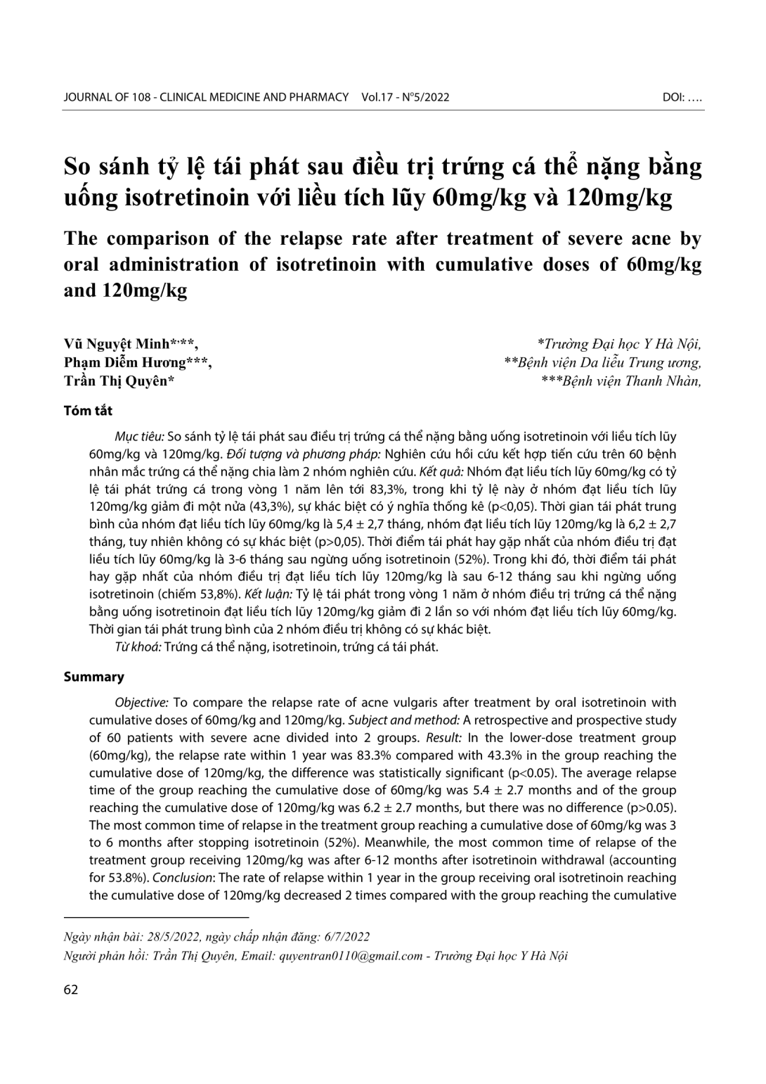So sánh tỷ lệ tái phát sau điều trị trứng cá thể nặng bằng uống isotretinoin với liều tích lũy 60mg/kg và 120mg/kg. Đối tượng và phương pháp: Nghiên cứu hồi cứu kết hợp tiến cứu trên 60 bệnh nhân mắc trứng cá thể nặng chia làm 2 nhóm nghiên cứu. Kết quả: Nhóm đạt liều tích lũy 60mg/kg có tỷ lệ tái phát trứng cá trong vòng 1 năm lên tới 83,3%, trong khi tỷ lệ này ở nhóm đạt liều tích lũy 120mg/kg giảm đi một nửa (43,3%), sự khác biệt có ý nghĩa thống kê (p0,05). Thời gian tái phát trung bình của nhóm đạt liều tích lũy 60mg/kg là 5,4 ± 2,7 tháng, nhóm đạt liều tích lũy 120mg/kg là 6,2 ± 2,7 tháng, tuy nhiên không có sự khác biệt (p>0,05). Thời điểm tái phát hay gặp nhất của nhóm điều trị đạt liều tích lũy 60mg/kg là 3-6 tháng sau ngừng uống isotretinoin (52%). Trong khi đó, thời điểm tái phát hay gặp nhất của nhóm điều trị đạt liều tích lũy 120mg/kg là sau 6-12 tháng sau khi ngừng uống isotretinoin (chiếm 53,8%). Kết luận: Tỷ lệ tái phát trong vòng 1 năm ở nhóm điều trị trứng cá thể nặng bằng uống isotretinoin đạt liều tích lũy 120mg/kg giảm đi 2 lần so với nhóm đạt liều tích lũy 60mg/kg. Thời gian tái phát trung bình của 2 nhóm điều trị không có sự khác biệt.