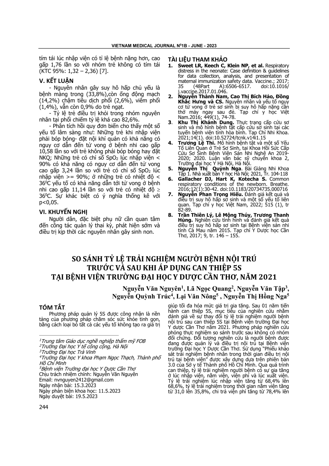 The 5S management approach is recognized as the foundation of lean healthcare, by eliminating all non-value-creating factors to maximize value-added. After 1 year of conducting 5S intervention, the objective of the study was to evaluate the change in the rate of inpatient experience after 5S intervention at the Hospital of Can Tho University of Medicine and Pharmacy in 2021. Research method Experimental simulation before and after without a control group. Research subjects are patients who are being managed and treated inpatients at the Hospital of Can Tho University of Medicine and Pharmacy. Using the "Patient experience survey questionnaire during inpatient treatment at the hospital" was built based on version 3.0 of the Department of Health of Ho Chi Minh City. Through the intervention process, the patient experience rate increased at admission, hospital stay, hospital fees and discharge. The rate of experience on admission increased from 68.4% to 68.6%, the rate of experience during hospital stay increased from 31.0 to 35.8%, hospital fee payment increased from 78.4% to 86.2% and at hospital discharge increased from 46.8% to 66.4%. The results showed that the overall inpatient experience rate increased from 12.25 to 16.6%. The study showed that the effectiveness of 5S intervention had a positive impact on increasing the rate of good experience in inpatients.