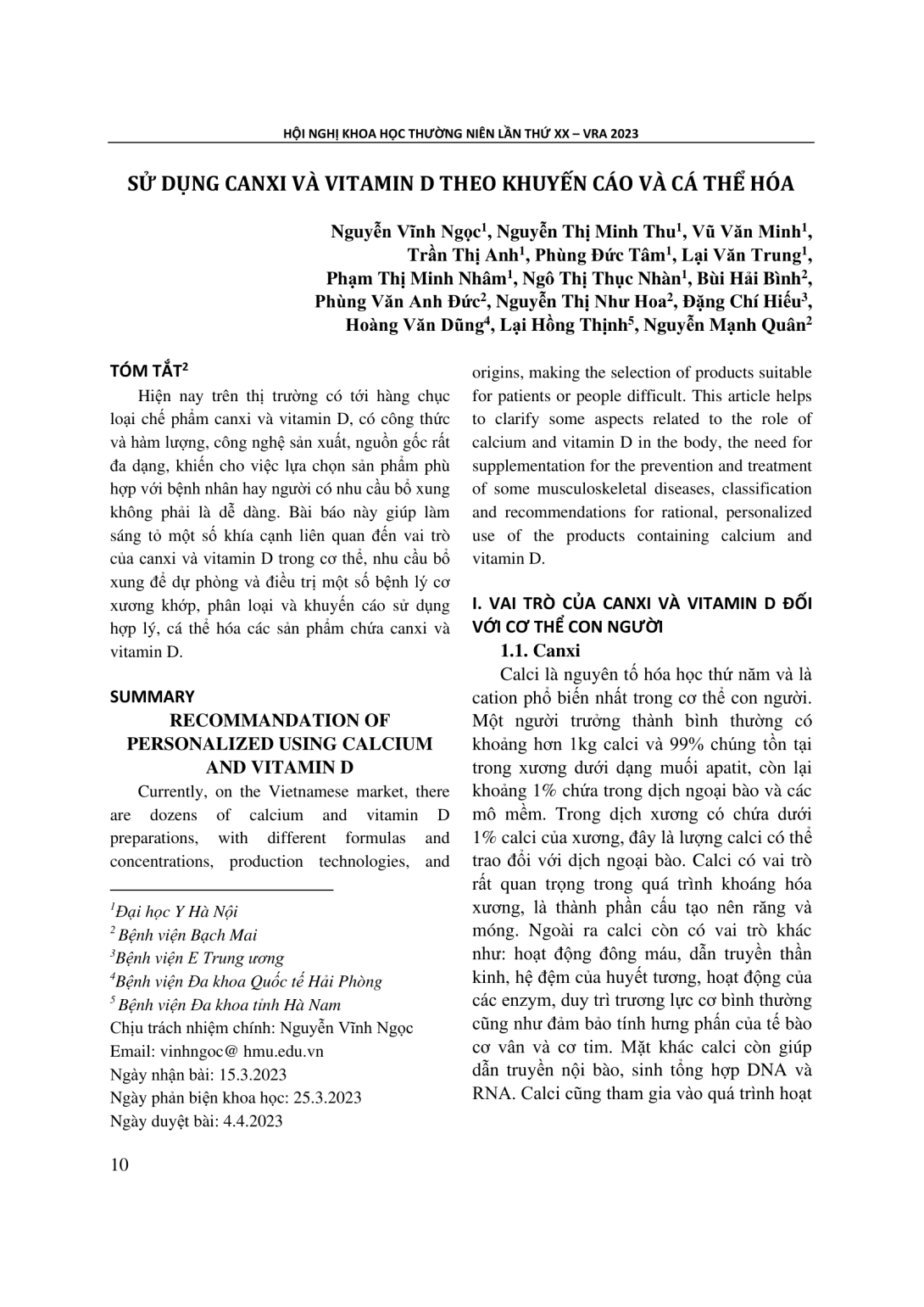 Hiện nay trên thị trường có tới hàng chục loại chế phẩm canxi và vitamin D, có công thức và hàm lượng, công nghệ sản xuất, nguồn gốc rất đa dạng, khiến cho việc lựa chọn sản phẩm phù hợp với bệnh nhân hay người có nhu cầu bổ xung không phải là dễ dàng. Bài báo này giúp làm sáng tỏ một số khía cạnh liên quan đến vai trò của canxi và vitamin D trong cơ thể, nhu cầu bổ xung để dự phòng và điều trị một số bệnh lý cơ xương khớp, phân loại và khuyến cáo sử dụng hợp lý, cá thể hóa các sản phẩm chứa canxi và vitamin D.