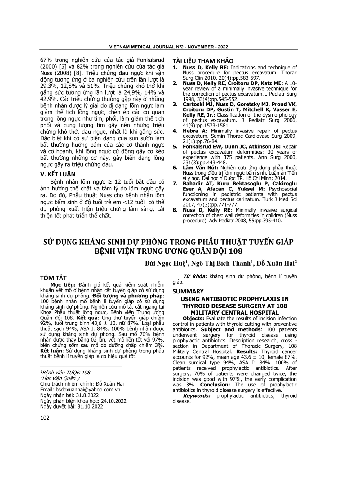 Đánh giá kết quả kiểm soát nhiễm khuẩn vết mổ ở bệnh nhân cắt tuyến giáp có sử dụng kháng sinh dự phòng. Đối tượng và phương pháp: 100 bệnh nhân mổ bệnh lí tuyến giáp có sử dụng kháng sinh dự phòng. Nghiên cứu mô tả, cắt ngang tại Khoa Phẫu thuật lồng ngực, Bệnh viện Trung ương Quân đội 108. Kết quả: Ung thư tuyến giáp chiếm 92%, tuổi trung bình 43,6 ± 10, nữ 87%. Loại phẫu thuật sạch 94%, ASA I: 84%. 100% bệnh nhân được sử dụng kháng sinh dự phòng. Sau mổ 70% bệnh nhân được thay băng 02 lần, vết mổ liền tốt với 97%, biến chứng sớm sau mổ dò dưỡng chấp chiếm 3%. Kết luận: Sử dụng kháng sinh dự phòng trong phẫu thuật bệnh lí tuyến giáp là có hiệu quả tốt.