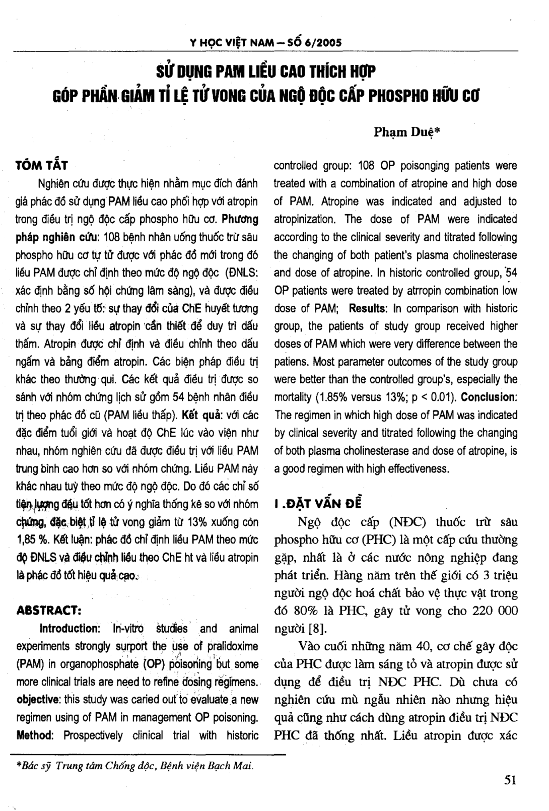 Sử dụng PAM liều cao thích hợp góp phần giảm tỷ lệ tử vong của ngộ độc cấp phospho hữu cơ