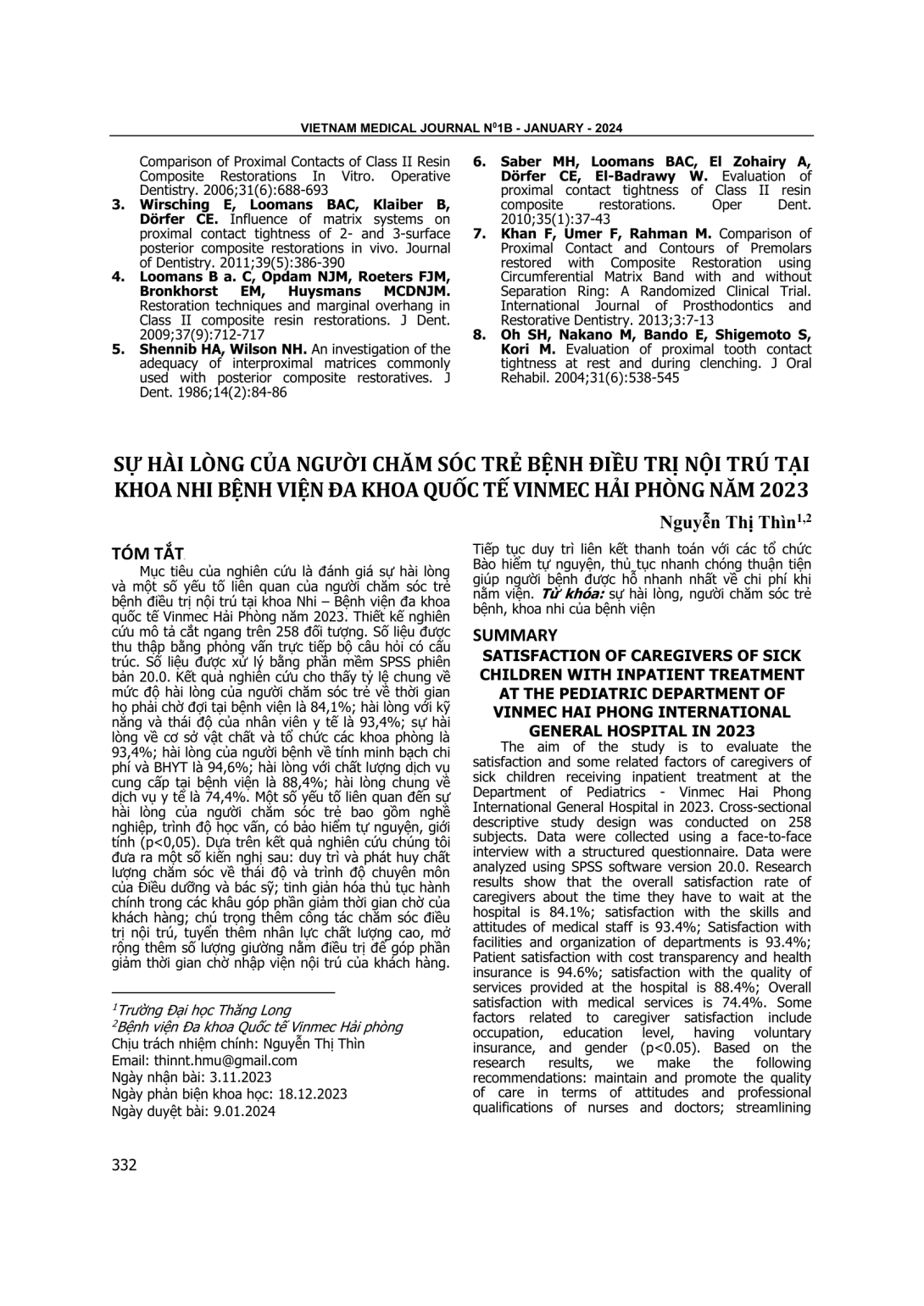 Mục tiêu của nghiên cứu là đánh giá sự hài lòng và một số yếu tố liên quan của người chăm sóc trẻ bệnh điều trị nội trú tại khoa Nhi – Bệnh viện đa khoa quốc tế Vinmec Hải Phòng năm 2023. Thiết kế nghiên cứu mô tả cắt ngang trên 258 đối tượng. Số liệu được thu thập bằng phỏng vấn trực tiếp bộ câu hỏi có cấu trúc. Số liệu được xử lý bằng phần mềm SPSS phiên bản 20.0. Kết quả nghiên cứu cho thấy tỷ lệ chung về mức độ hài lòng của người chăm sóc trẻ về thời gian họ phải chờ đợi tại bệnh viện là 84,1%; hài lòng với kỹ năng và thái độ của nhân viên y tế là 93,4%; sự hài lòng về cơ sở vật chất và tổ chức các khoa phòng là 93,4%; hài lòng của người bệnh về tính minh bạch chi phí và BHYT là 94,6%; hài lòng với chất lượng dịch vụ cung cấp tại bệnh viện là 88,4%; hài lòng chung về dịch vụ y tế là 74,4%. Một số yếu tố liên quan đến sự hài lòng của người chăm sóc trẻ bao gồm nghề nghiệp, trình độ học vấn, có bảo hiểm tự nguyện, giới tính (p<0,05). Dựa trên kết quả nghiên cứu chúng tôi đưa ra một số kiến nghị sau: duy trì và phát huy chất lượng chăm sóc về thái độ và trình độ chuyên môn của Điều dưỡng và bác sỹ; tinh giản hóa thủ tục hành chính trong các khâu góp phần giảm thời gian chờ của khách hàng; chú trọng thêm công tác chăm sóc điều trị nội trú, tuyển thêm nhân lực chất lượng cao, mở rộng thêm số lượng giường nằm điều trị để góp phần giảm thời gian chờ nhập viện nội trú của khách hàng. Tiếp tục duy trì liên kết thanh toán với các tổ chức Bào hiểm tự nguyện, thủ tục nhanh chóng thuận tiện giúp người bệnh được hỗ nhanh nhất về chi phí khi nằm viện.