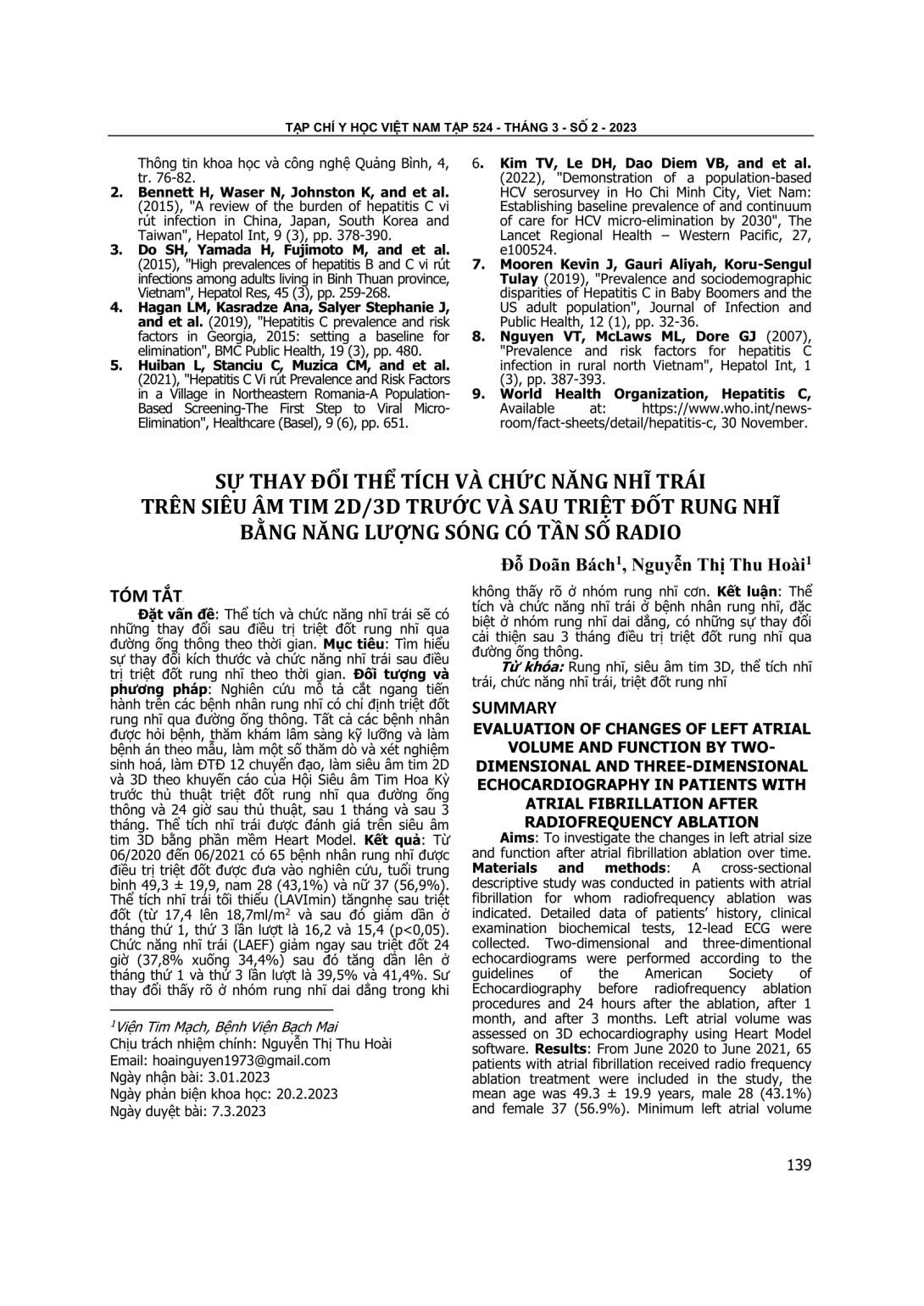 To investigate the changes in left atrial size and function after atrial fibrillation ablation over time. Materials and methods: A cross-sectional descriptive study was conducted in patients with atrial fibrillation for whom radiofrequency ablation was indicated. Detailed data of patients’ history, clinical examination biochemical tests, 12-lead ECG were collected. Two-dimensional and three-dimentional echocardiograms were performed according to the guidelines of the American Society of Echocardiography before radiofrequency ablation procedures and 24 hours after the ablation, after 1 month, and after 3 months. Left atrial volume was assessed on 3D echocardiography using Heart Model software. Results: From June 2020 to June 2021, 65 patients with atrial fibrillation received radio frequency ablation treatment were included in the study, the mean age was 49.3 ± 19.9 years, male 28 (43.1%) and female 37 (56.9%). Minimum left atrial volume (LAVImin) slightly increased after ablation (from 17.4 to 18.7ml/m2 and then gradually decreased at the 1st and the 3rd month, respectively, 16.2 and 15.4, p<0.05. Left atrial function (LAEF) decreased after ablation (37.8% to 34.4%) and then gradually increased at month 1 and 3 by 39.5% and 41.4%, respectively. The change was evident in the persistent AF group while not clearly in the paroxysmal atrial fibrillation group. Conclusion: Left atrial volume and function in patients with atrial fibrillation changed after radiofrequency ablation therapy, showing the improvement of left atrial function after thee-month follow-up duration, especially in the persistent atrial fibrillation group.