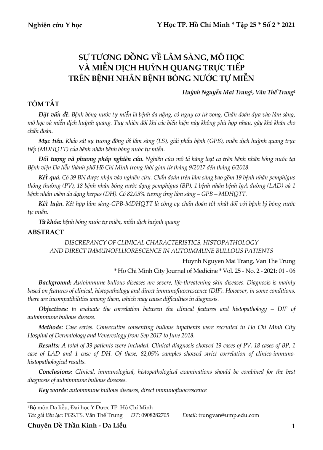 Khảo sát sự tương đồng về lâm sàng (LS), giải phẫu bệnh (GPB), miễn dịch huỳnh quang trực tiếp (MDHQTT) của bệnh nhân bệnh bóng nước tự miễn. Đối tượng và phương pháp nghiên cứu. Nghiên cứu mô tả hàng loạt ca trên bệnh nhân bóng nước tại Bệnh viện Da liễu thành phố Hồ Chí Minh trong thời gian từ tháng 9/2017 đến tháng 6/2018. Kết quả. Có 39 BN được nhận vào nghiên cứu. Chẩn đoán trên lâm sàng bao gồm 19 bệnh nhân pemphigus thông thường (PV), 18 bệnh nhân bóng nước dạng pemphigus (BP), 1 bệnh nhân bệnh IgA đường (LAD) và 1 bệnh nhân viêm da dạng herpes (DH). Có 82,05% tương ứng lâm sàng – GPB – MDHQTT. Kết luận. Kết hợp lâm sàng-GPB-MDHQTT là công cụ chẩn đoán tốt nhất đối với bệnh lý bóng nước tự miễn.