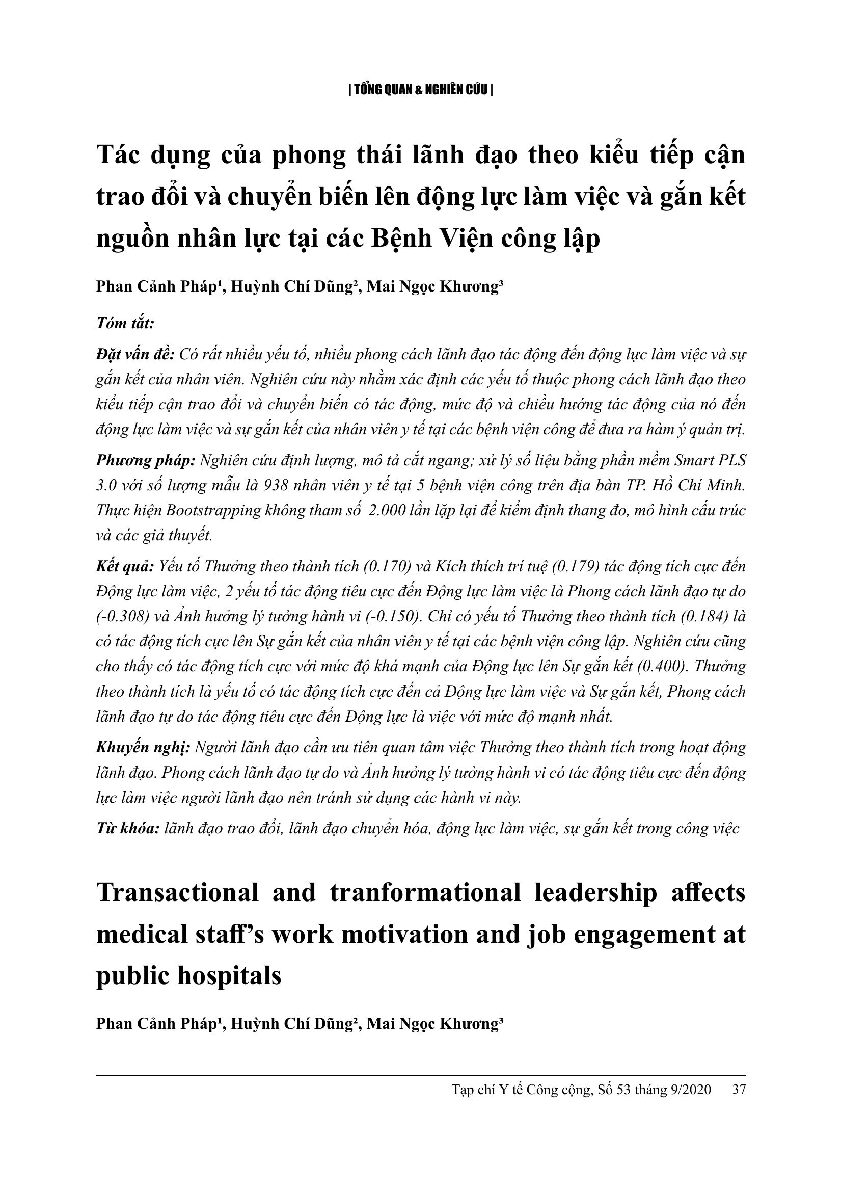 Đặt vấn đề Có rất nhiều yếu tố, nhiều phong cách lãnh đạo tác động đến động lực làm việc và sự gắn kết của nhân viên. Nghiên cứu này nhằm xác định các yếu tố thuộc phong cách lãnh đạo theo kiểu tiếp cận trao đổi và chuyển biến có tác động, mức độ và chiều hướng tác động của nó đến động lực làm việc và sự gắn kết của nhân viên y tế tại các bệnh viện công để đưa ra hàm ý quản trị. Phương pháp Nghiên cứu định lượng, mô tả cắt ngang; xử lý số liệu bằng phần mềm Smart PLS 3.0 với số lượng mẫu là 938 nhân viên y tế tại 5 bệnh viện công trên địa bàn TP. Hồ Chí Minh. Thực hiện Bootstrapping không tham số 2.000 lần lặp lại để kiểm định thang đo, mô hình cấu trúc và các giả thuyết. Kết quả Yếu tố Thưởng theo thành tích (0.170) và Kích thích trí tuệ (0.179) tác động tích cực đến Động lực làm việc, 2 yếu tố tác động tiêu cực đến Động lực làm việc là Phong cách lãnh đạo tự do (-0.308) và Ảnh hưởng lý tưởng hành vi (-0.150). Chỉ có yếu tố Thưởng theo thành tích (0.184) là có tác động tích cực lên Sự gắn kết của nhân viên y tế tại các bệnh viện công lập. Nghiên cứu cũng cho thấy có tác động tích cực với mức độ khá mạnh của Động lực lên Sự gắn kết (0.400). Thưởng theo thành tích là yếu tố có tác động tích cực đến cả Động lực làm việc và Sự gắn kết, Phong cách lãnh đạo tự do tác động tiêu cực đến Động lực là việc với mức độ mạnh nhất. Khuyến nghị Người lãnh đạo cần ưu tiên quan tâm việc Thưởng theo thành tích trong hoạt động lãnh đạo. Phong cách lãnh đạo tự do và Ảnh hưởng lý tưởng hành vi có tác động tiêu cực đến động lực làm việc người lãnh đạo nên tránh sử dụng các hành vi này.