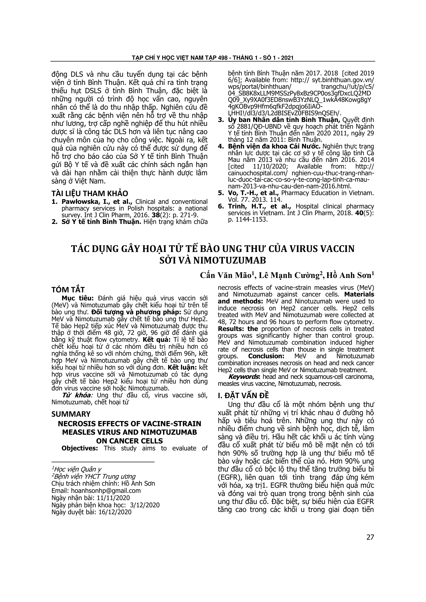 Đánh giá hiệu quả virus vaccin sởi (MeV) và Nimotuzumab gây chết kiểu hoại tử trên tế bào ung thư. Đối tượng và phương pháp Sử dụng MeV và Nimotuzumab gây chết tế bào ung thư Hep2. Tế bào Hep2 tiếp xúc MeV và Nimotuzumab được thu thập ở thời điểm 48 giờ, 72 giờ, 96 giờ để đánh giá bằng kỹ thuật flow cytometry. Kết quả Tỉ lệ tế bào chết kiểu hoại tử ở các nhóm điều trị nhiều hơn có nghĩa thống kê so với nhóm chứng, thời điểm 96h, kết hợp MeV và Nimotuzumab gây chết tế bào ung thư kiểu hoại tử nhiều hơn so với dùng đơn. Kết luận kết hợp virus vaccine sởi và Nimotuzumab có tác dụng gây chết tế bào Hep2 kiểu hoại tử nhiều hơn dùng đơn virus vaccine sởi hoặc Nimotuzumab.